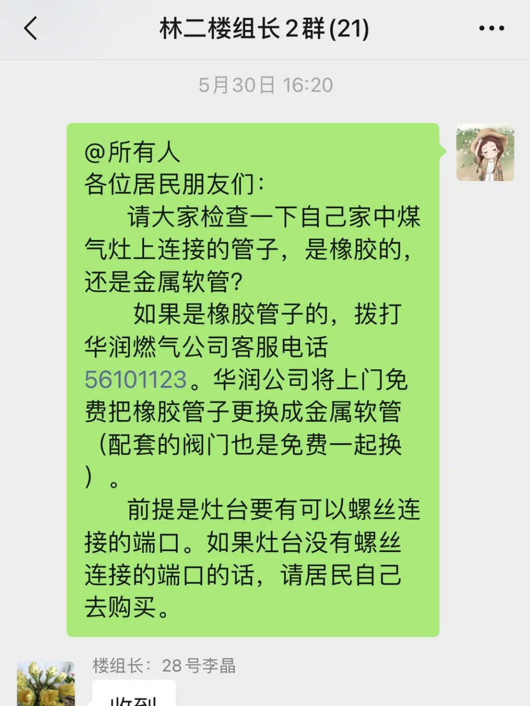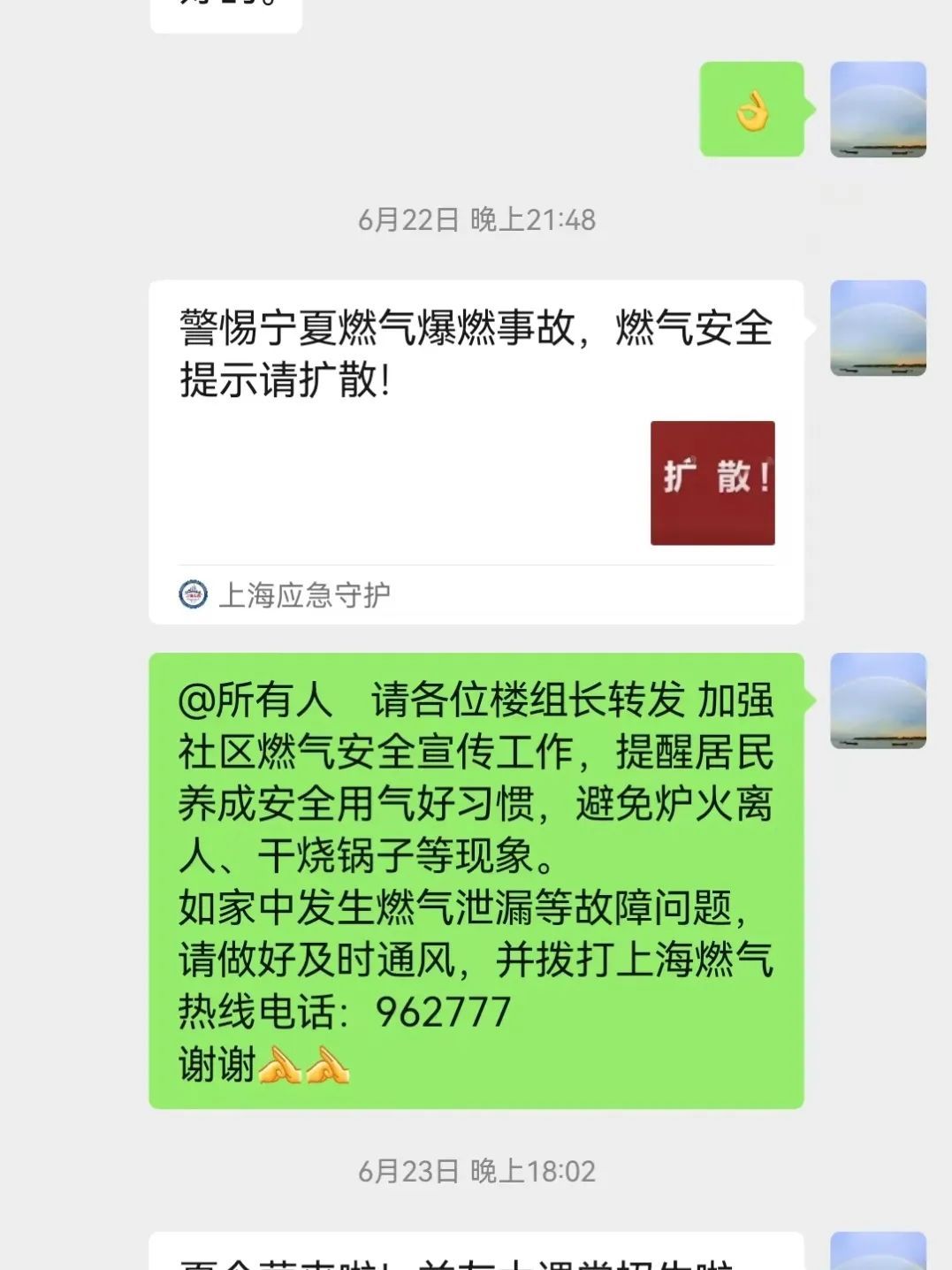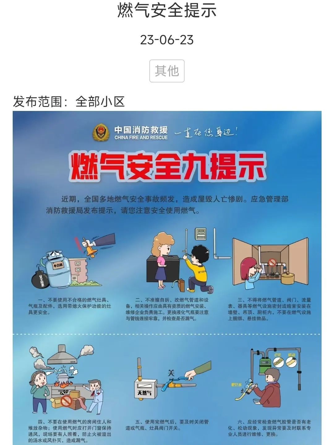 通过社区通和楼组群,向居民强调了关闭燃气阀门的重要性,以及定期检查燃气设备和管道的必要性。