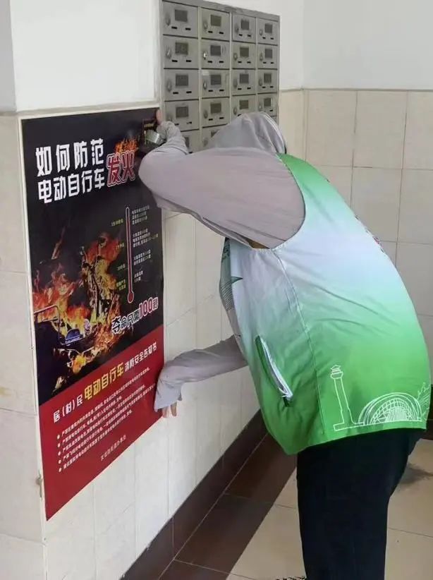 此外,针对电动自行车消防安全问题进行了海报张贴,并邀请楼组长逐一对楼道内有电瓶车的家庭发放安全告知书,确保家家户户务必知晓。