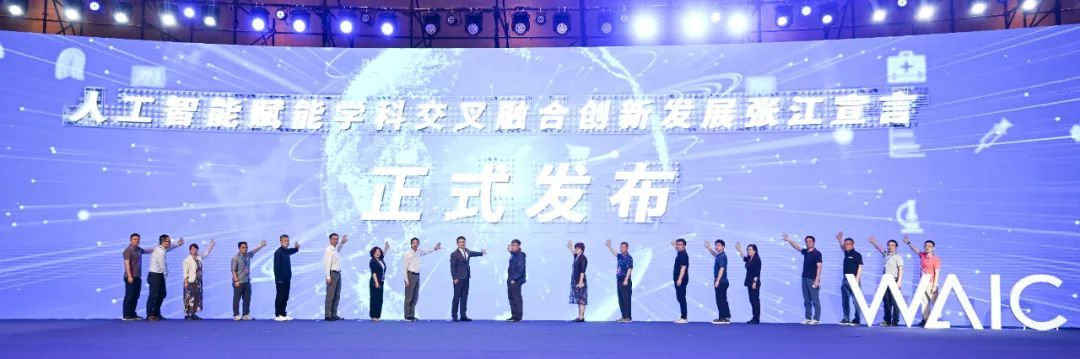 来自一批全国“双一流”建设高校、知名科研院所和企业的代表共同触摸屏幕上的科技光点,《人工智能赋能学科交叉融合创新发展张江宣言》正式发布。