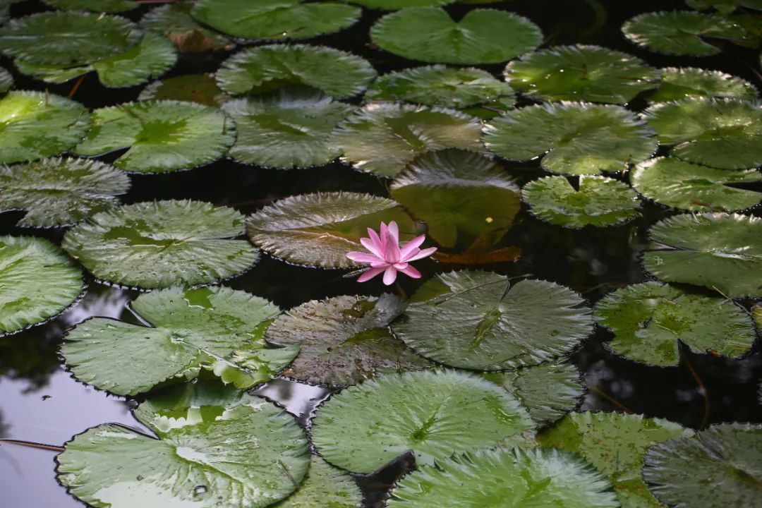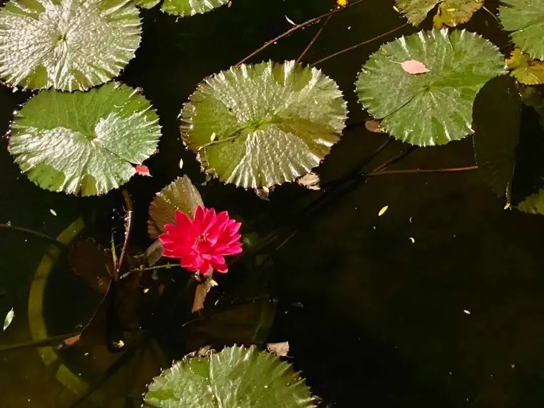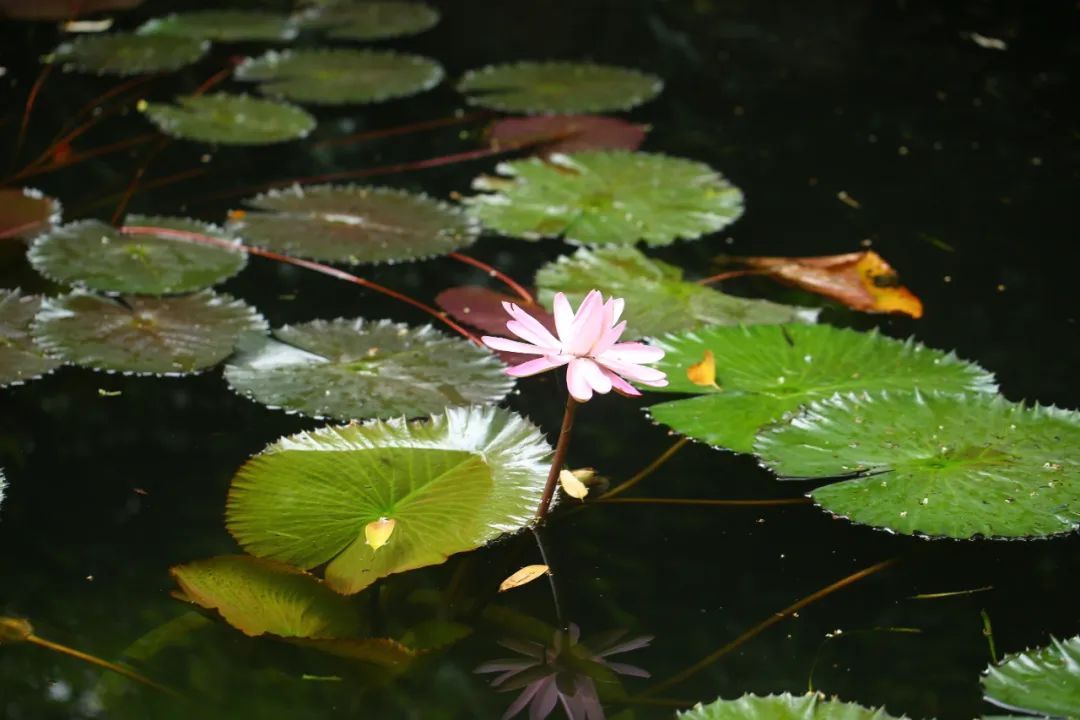 顾名思义,大部分睡莲通常都是在白天开放,夜晚闭合。不过,这个家族中也有一些种类是“夜猫子”,即花在白天闭合,夜晚开放。夜开型睡莲虽然都是在夜间开花,但一般都会持续到第二天上午,所以早上也是可以一睹它们芳容的。今年荷花展新引进的夜开型睡莲一共有4个品种共约30盆,有粉色的‘泰国粉’,白色的‘喀麦隆’,红色系的‘红色闪耀’以及‘安德瑞斯’,可谓色彩缤纷、花叶俱佳。鸳鸯厅西侧鱼池正是今年新引进的夜开睡莲展示点之一,此外,还有大部分夜开睡莲在白鹤亭水域进行展示。
