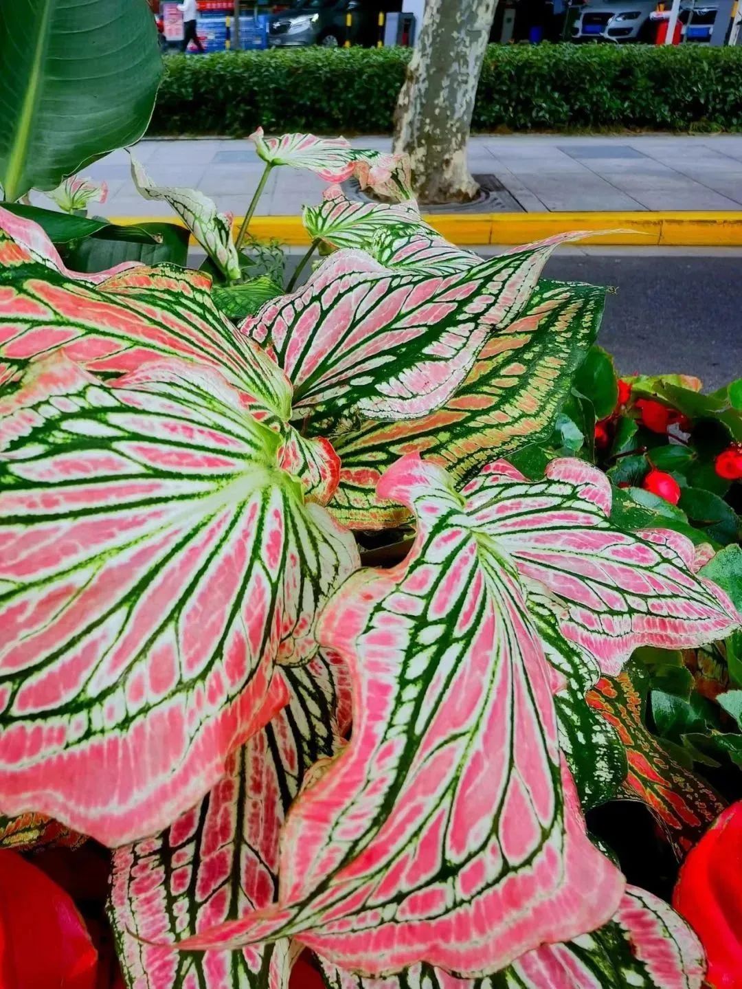 其中,彩叶芋、粗肋草、四季海棠等带来了不同饱和度的红色作为主打色。玉簪、彩叶芋等绿白相间的观花观叶植物,则为热情的红色带来了一缕清凉之感,沿街望去,红绿相间的花卉如同炎炎夏日里的一杯西瓜气泡水,凉爽又治愈。