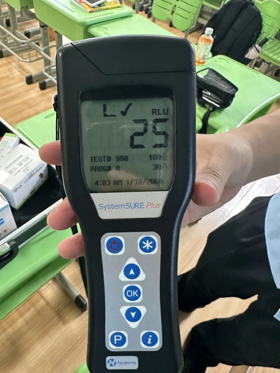 利用ATP荧光检测仪对餐具以及人员手部进行洁净度快速检测,排除风险隐患。(ATP检测数值≤100即合格)