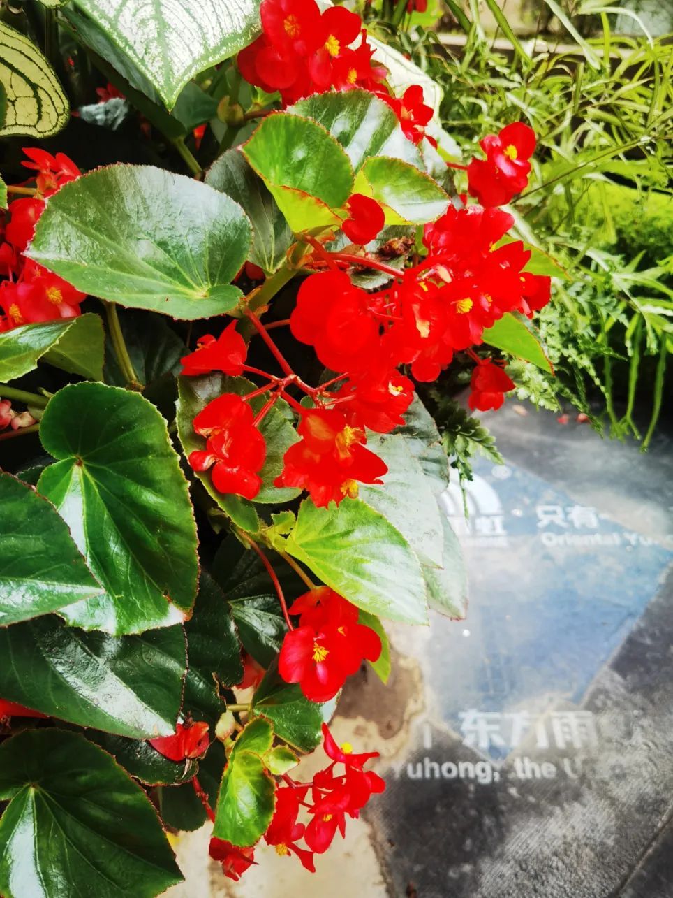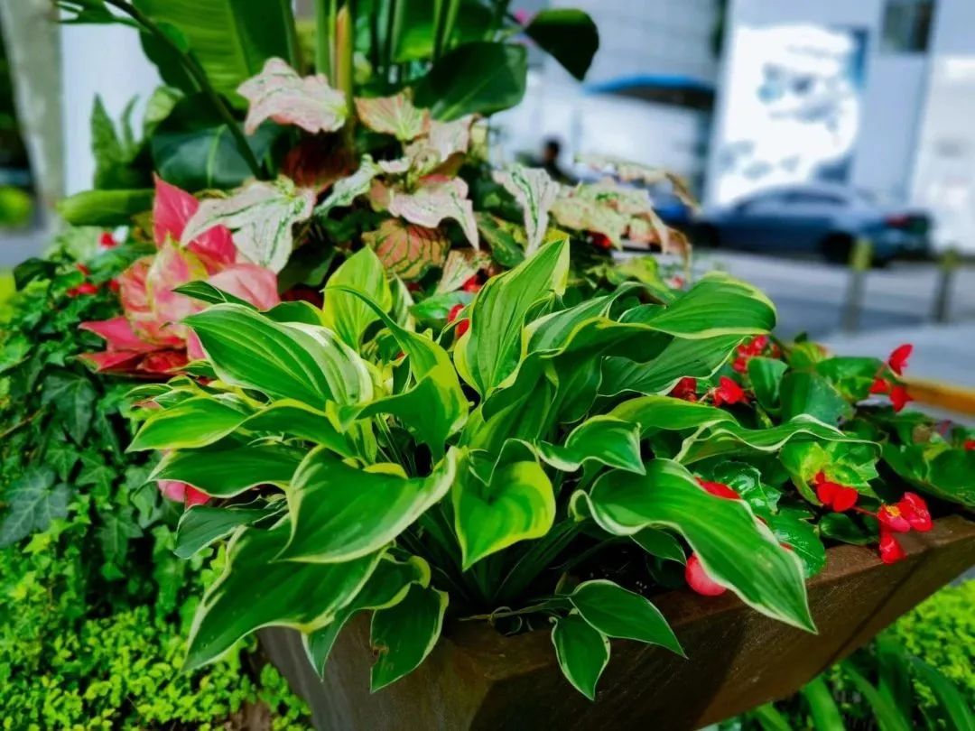 其中,彩叶芋、粗肋草、四季海棠等,带来了不同饱和度的红色作为主打色。玉簪、彩叶芋等绿白相间的观花观叶植物,则为热情的红色带来了一缕清凉之感,沿街望去,红绿相间的花卉如同炎炎夏日里的一杯西瓜气泡水,凉爽又治愈。
