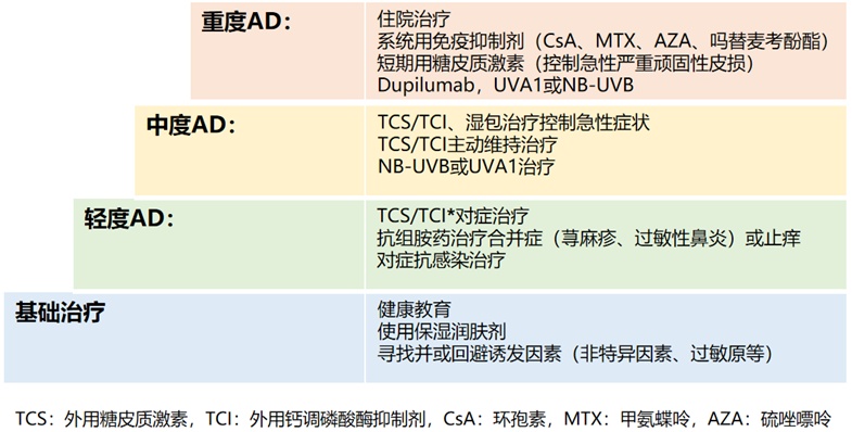 目前,特应性皮炎的治疗根据患者病情的不同严重程度采用阶梯模式,治疗药物主要包括以下几类:
