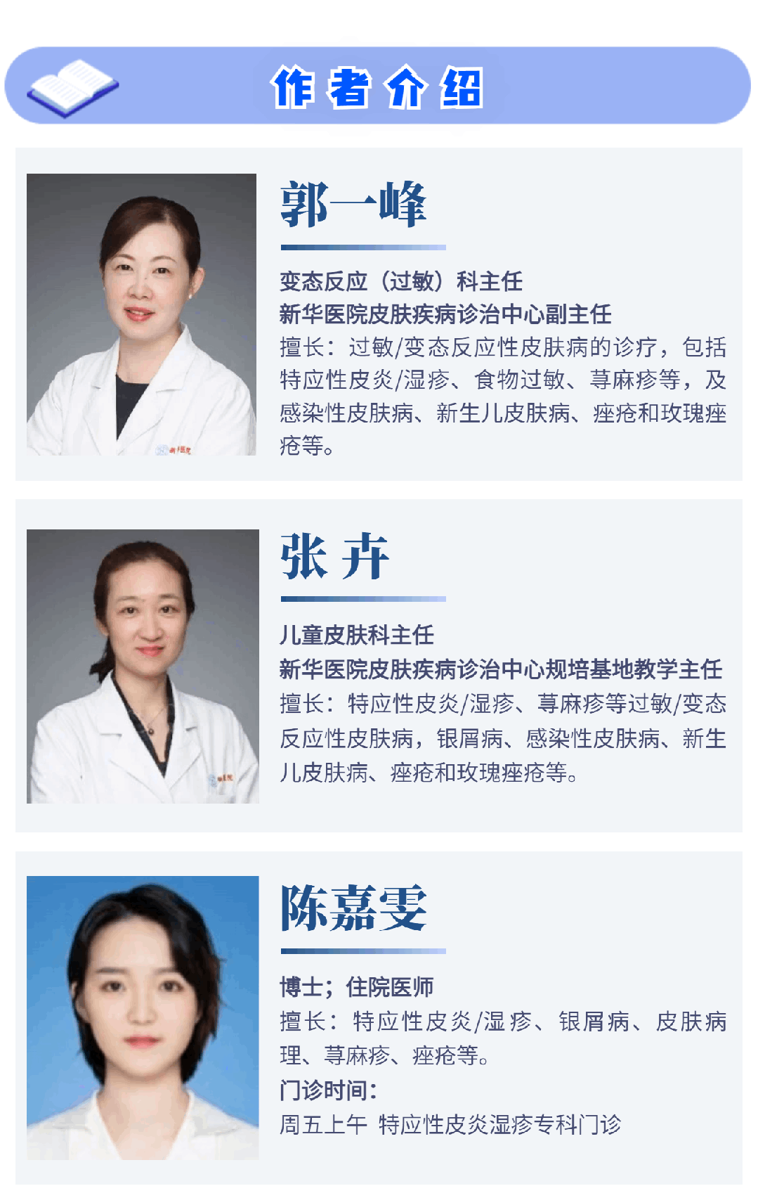 上海交通大学医学院附属新华医院皮肤疾病诊治中心是国家临床重点专科、上海市“重中之重”临床重点学科,变态反应(过敏)科是新华医院皮肤中心的优势亚专业。变态反应(过敏)科聚焦于特应性皮炎/湿疹、荨麻疹、接触性皮炎、药物疹、食物过敏等过敏性疾病的临床诊疗、预防与基础研究。特应性皮炎(湿疹)的临床与基础研究更是处于国际先进水平,创立了中国婴儿与儿童特应性皮炎诊断标准,开创利多卡因静脉封闭治疗顽固难治性特应性皮炎的新方法,牵头制定《中国儿童特应性皮炎诊疗专家共识》,是中华医学会皮肤性病学分会“特应性皮炎研究中心”。
