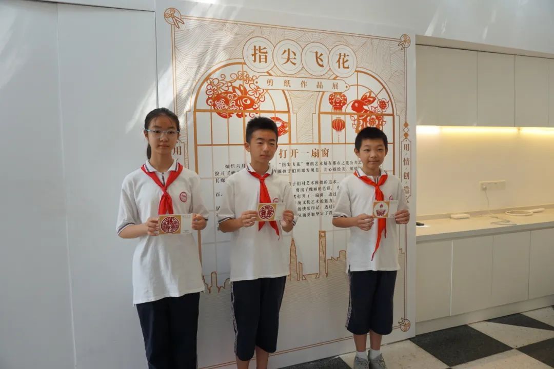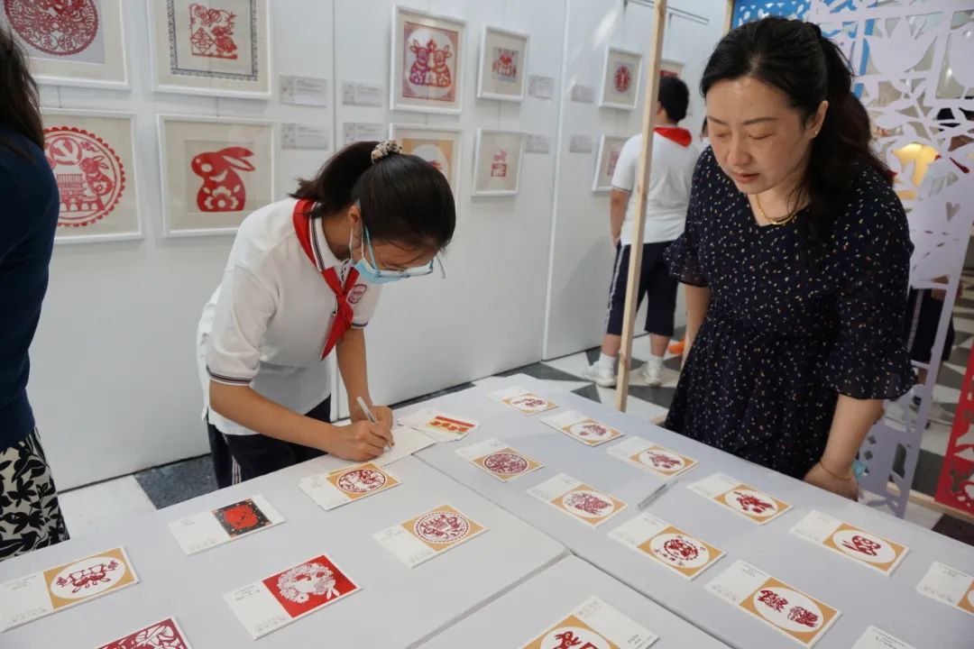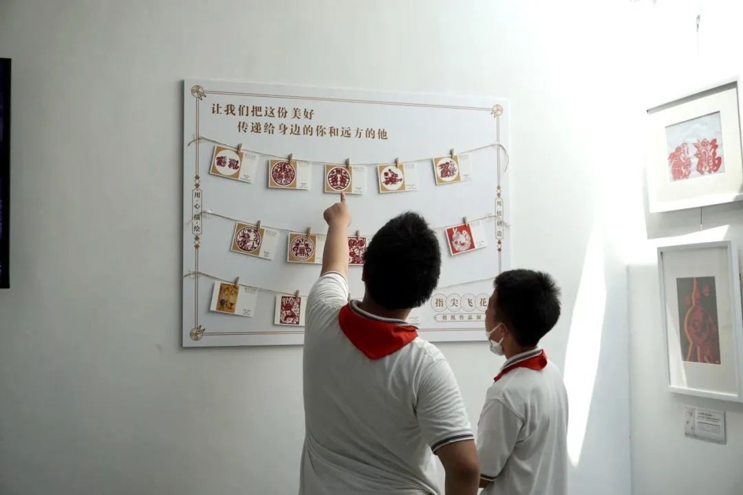 “这张是我小学老师的剪纸作品,我要寄明信片给他!”一位观展的同学惊喜地说道。