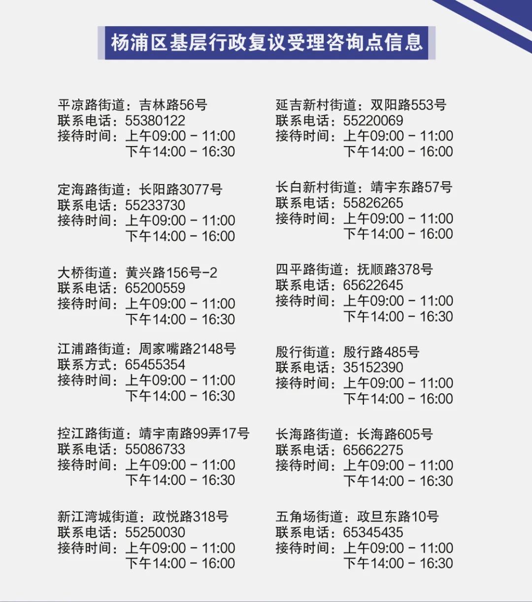 为了方便社区居民就近咨询行政复议,杨浦区司法局通过“区政府实事项目”这一契机,在全区12个街道司法所内建立了12个杨浦区基层行政复议受理咨询点,让有需求的群众在家门口就能享受到行政复议服务,解决身边的小微争议。