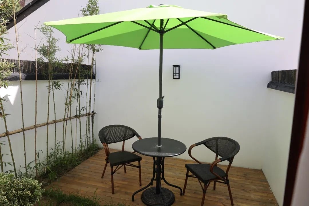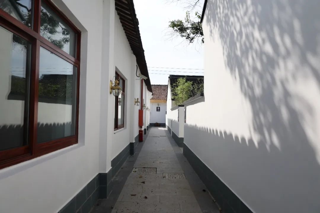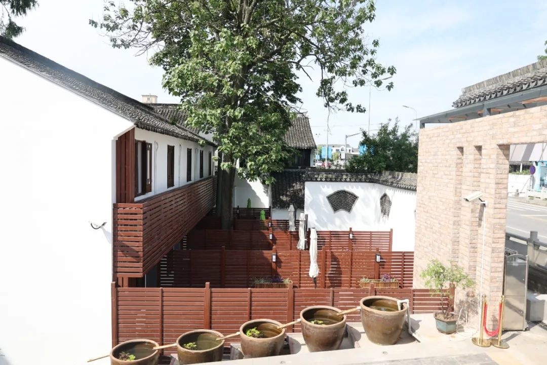 为了将闲置资源更好地利用起来,沈伟也是动了不少脑筋。在改建过程中他特别注重古镇与现代元素相结合,使得整个酒店延续了古镇原有的建筑风格。记者在“院子”里看到,周围的参天大树枝叶繁茂,为整个酒店添了绿色生机。“我们希望带来一些变化,但也要和枫泾的历史文化紧密结合。”沈伟表示,从项目的策划设计到建设落地,整体风貌保留着古镇错落的组团关系和建筑风格,白墙灰瓦、河道植栽和程十发祖居融为一体,像是一幅淡雅的古镇水墨画,延续枫泾江南水乡的文脉风韵。
