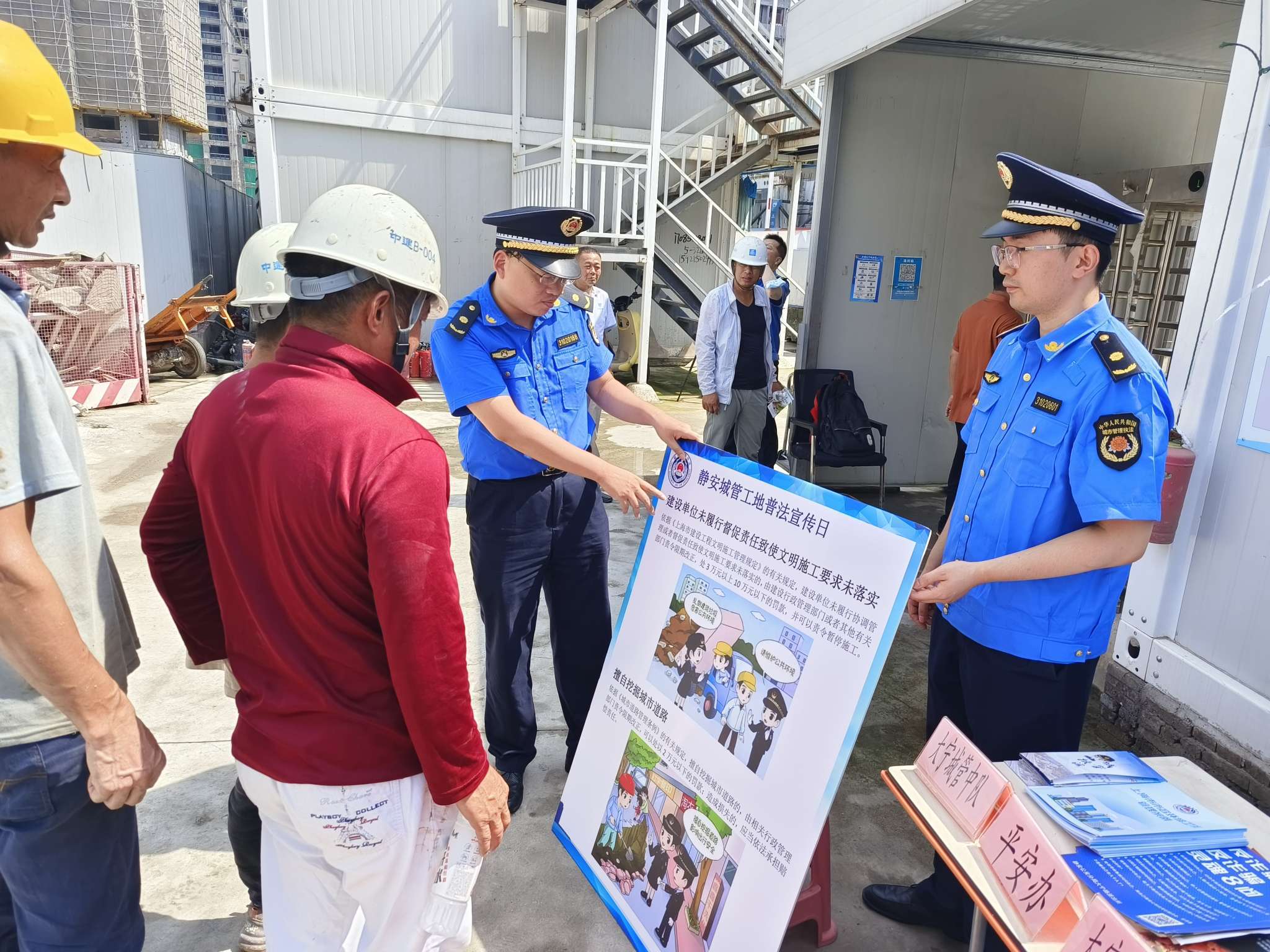 近日,为进一步规范建筑工地的施工行为,增强施工人员的法治观念,大宁路街道综合行政执法队联合多个部门来到静安天悦的施工现场,开展普法宣传活动。