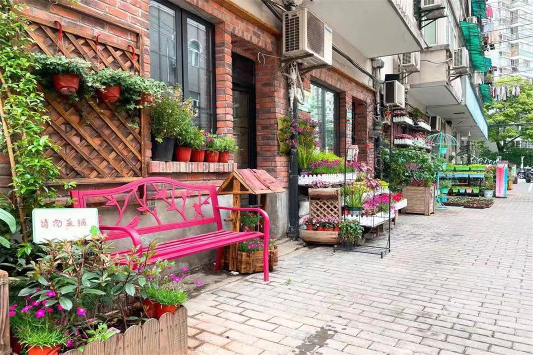 位于江阴街465号的都市绿农园艺实践中心是黄浦区文化公益促进会的主要阵地,是一间被花卉绿植簇拥的沿街小屋,一把亮色长椅点缀其中,让过路人可以停下脚步享受慢生活。