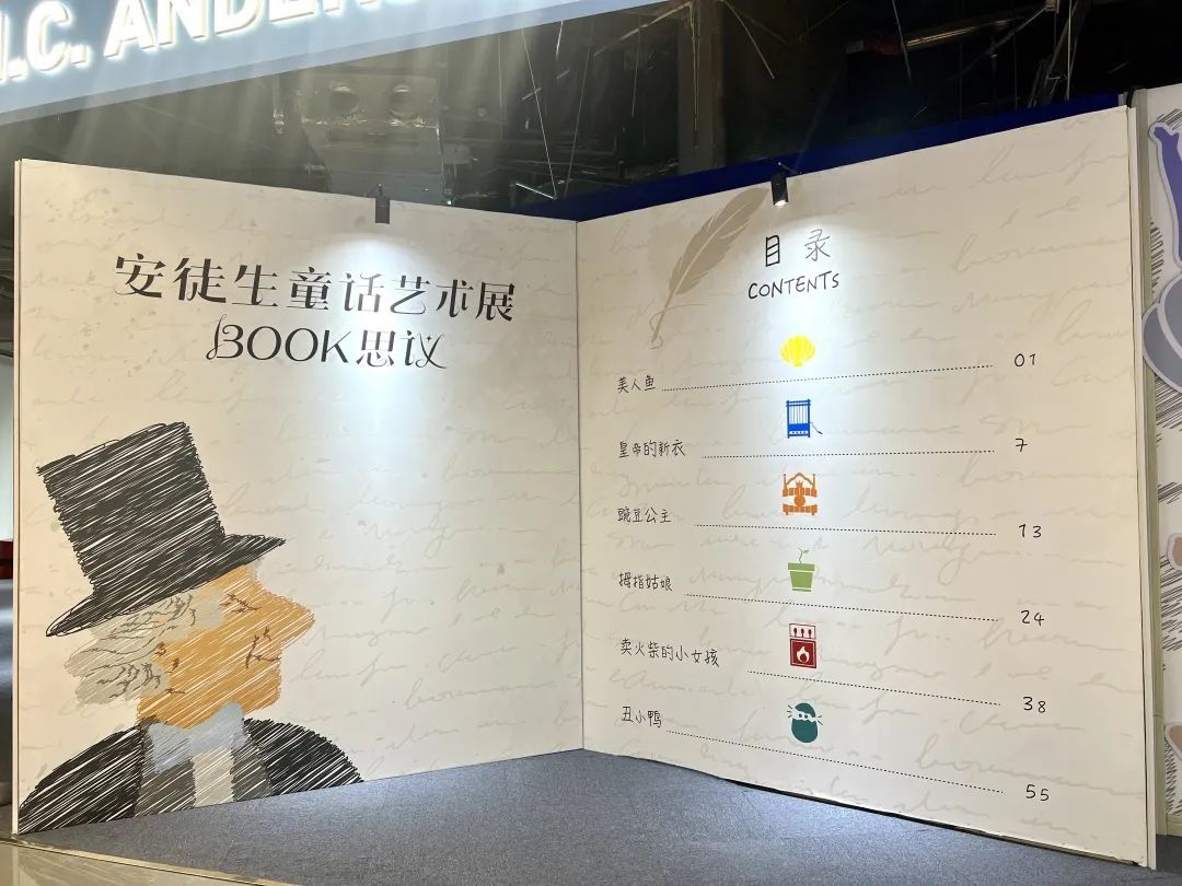 展览现场展出由丹麦安徒生博物馆官方授权的38件涵盖安徒生本人历史图像、手稿文献、剪纸、绘画原作和影像作品的数字展品,以及来自世界各地40余件与《安徒生童话》有关的各国邮票、珍藏书籍、手绘插画、连环画和各类珍贵的实物藏品。
