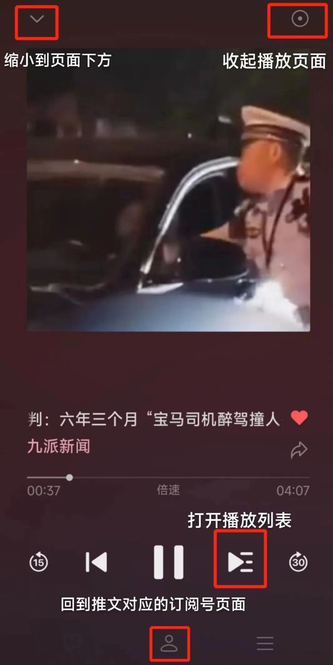 点击“朗读”便可以跳转到播放页面,在页面上可以实现调节播放进度、设置倍速、转发、返回推文页面、打开播放列表等操作。