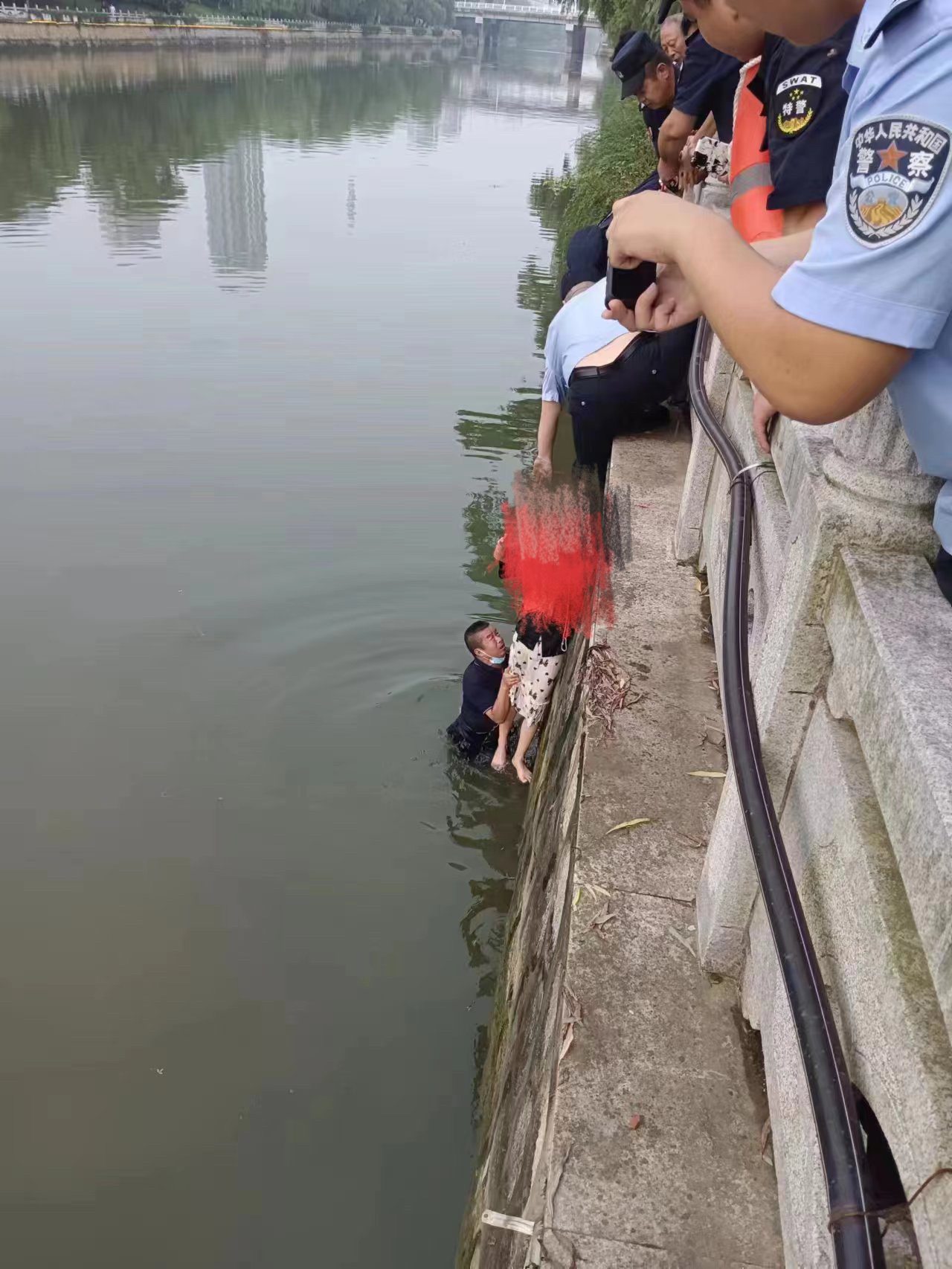 “姑娘,我闺女和你差不多大,你别伤心,有什么坎跟我讲。”李明一边轻声宽慰,一边帮她穿上救生衣、绑紧救援绳。随后,李明在水中托举着对方,配合民警魏超、杨镇和多名辅警往岸上拉,众人齐心协力,最终成功将该女子救助上岸。