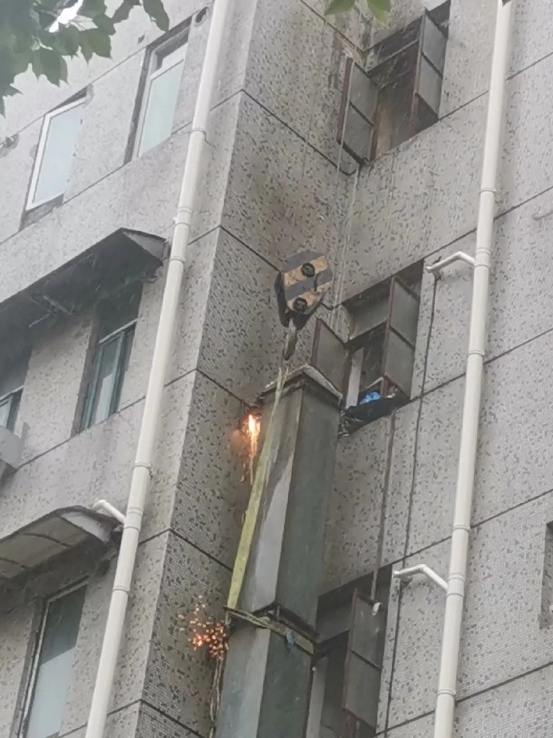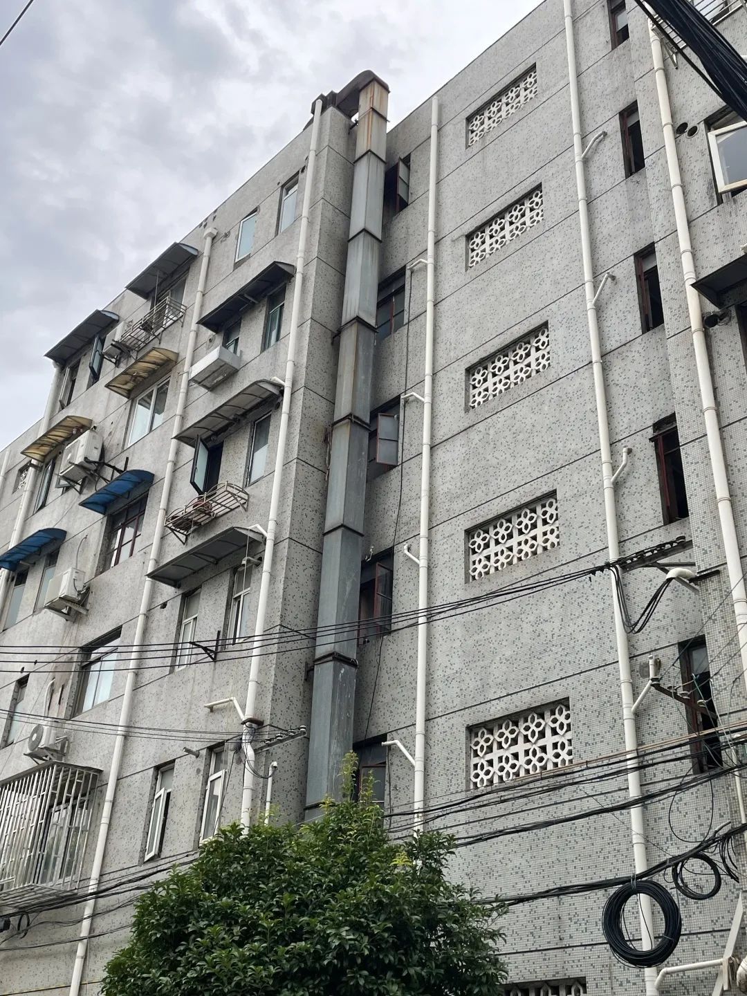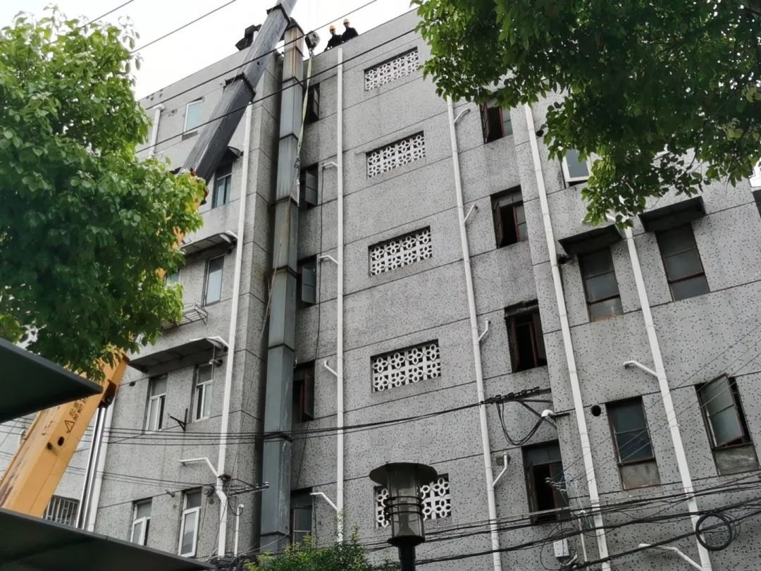 居委工作人员第一时间和物业负责人前往现场查看,并了解具体情况。原来这根烟囱已经废弃有一段时间了,是长逸路临街一家餐饮店遗留的油烟排放管道。目前餐饮店已搬迁,但楼道外置的排烟管道因缺乏维护变得年久失修、锈迹斑斑、损坏严重。由于拆除难度较大,一直未得到妥善处置,导致废弃烟囱成了附近居民的一块心病。
