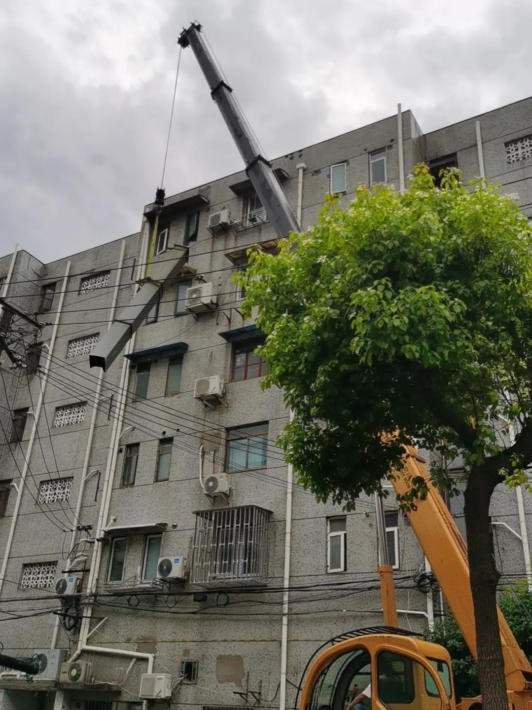 拆除烟囱的前一天,居委会通过楼组群告知196号居民相关事宜,并提醒大家注意安全。当天,居委工作人员、物业工作人员、志愿者来到现场,引导过往居民绕道通行、注意安全。另一边,执法队工作人员拉起警戒线、设立施工标牌,工人们戴好安全帽,认真操作施工设备。通过大型吊机与人力配合的方式,完成螺丝拆除、解体、装车收运等步骤。