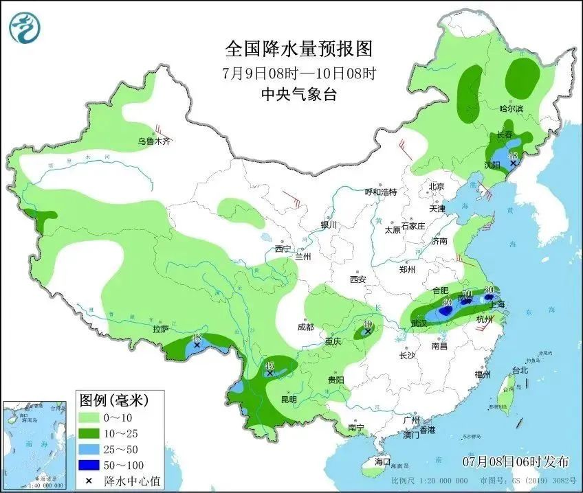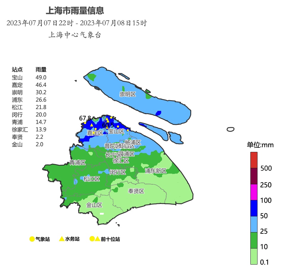 雨情:7月7日22时至7月8日15时降雨量统计显示,国家气象站中下得最大的是宝山站49.0毫米,其次是嘉定站46.4毫米。