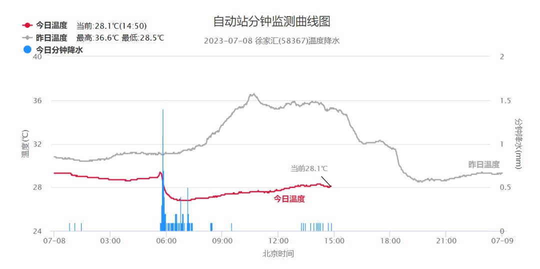 中心城区徐家汇站白天最高气温28.3度,比昨天同期降了8度多,但空气湿度大,体感温度比较高,较闷热。