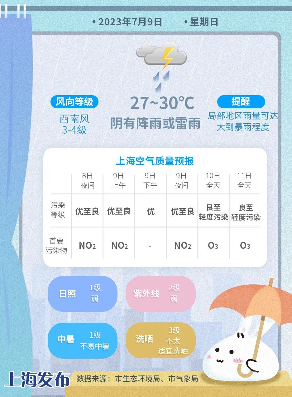 明天气温27~30度,西南风3~4级,沿江沿海地区4-5级,雷雨时阵风7-9级,风向偏北,湿度95%~80%。