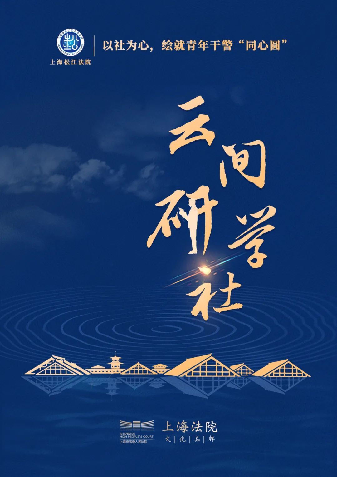 云间研学社因松江别称“云间”且社团兼顾政治理论研习、司法应用研究、心性品质研修的三“研”属性而命名。立足上海之根和G60科创走廊创新策源地,坚持文化树人,围绕法院中心工作建立云间天平文化矩阵,筑巢“云中雁”青年成长营,培根育苗助力青年成长。