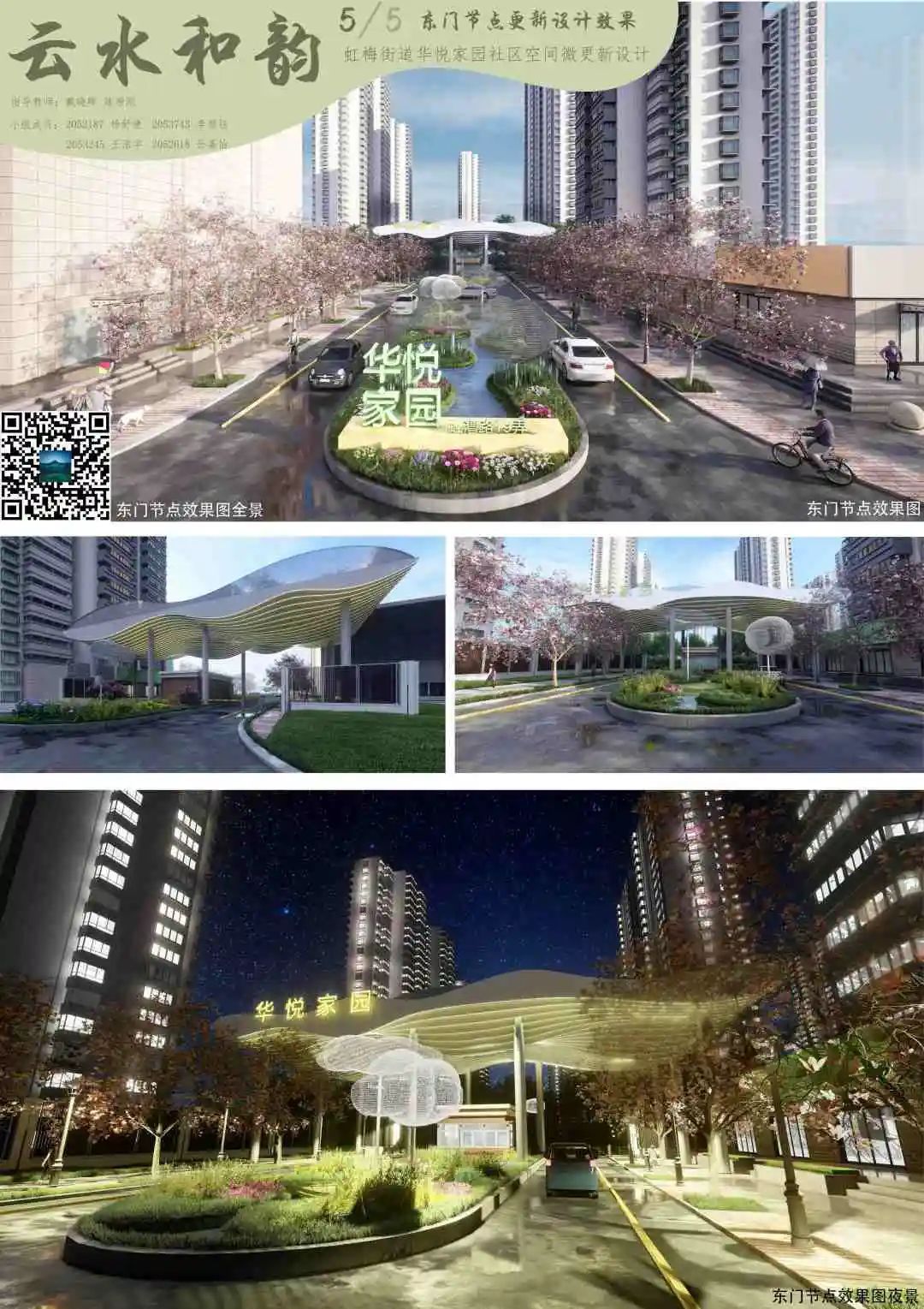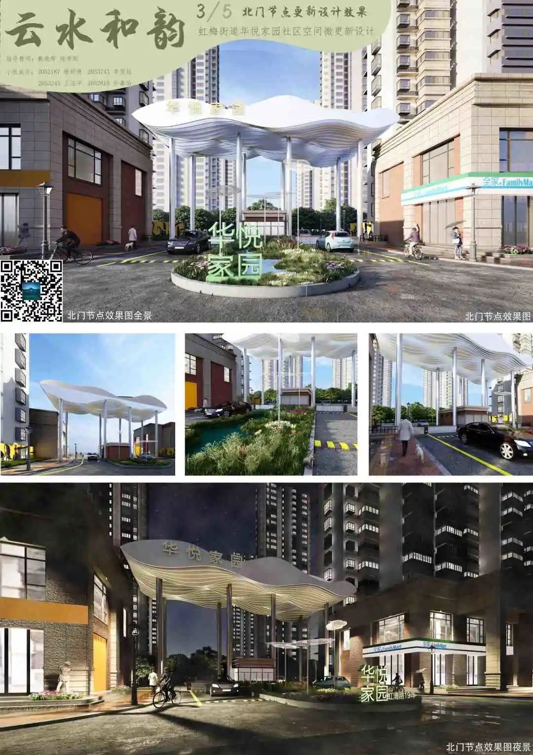 陆希刚作为华悦家园课题组的另一位带课老师,带领学生多次前往实地进行充分调研后做出了设计方案,“本次社区微更新教学的规划设计对象为社区出入口门户,学生方案在充分关注交通渠化、出入管理等基本功能的基础上,充分结合社区自身特征和居民诉求,强调出入口门户的景观和文化寓意特征,凝练了以云水、亭树为主体的两组方案,兼顾了实用、美观、吉祥的设计意图。”