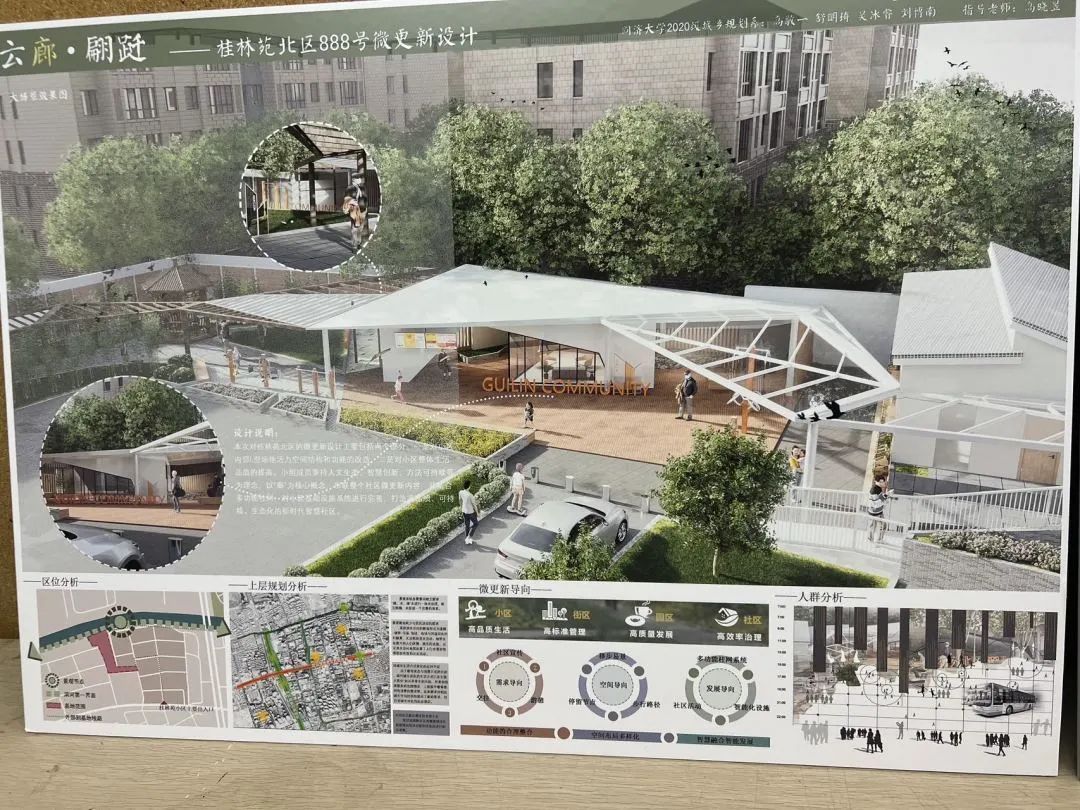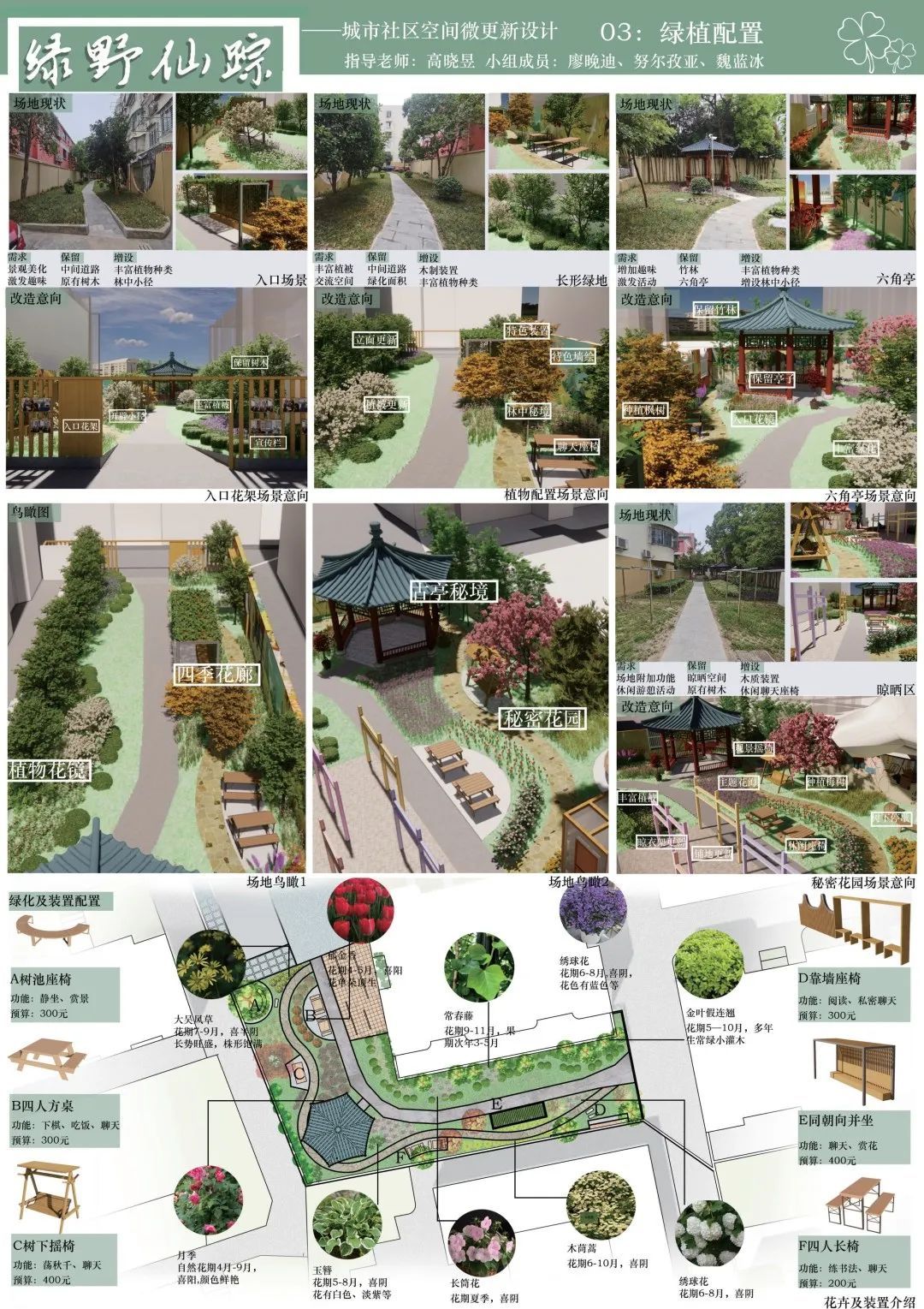指导教师则以两种创意为基础,引导两组学生从微更新的“微”和 “新”两方面进一步强化设计特色,结合设计过程中汇报交流情况和居民意见征集,最终修改形成了“云廊翩跹”和“绿野仙踪”两个桂林苑小区微更新方案。