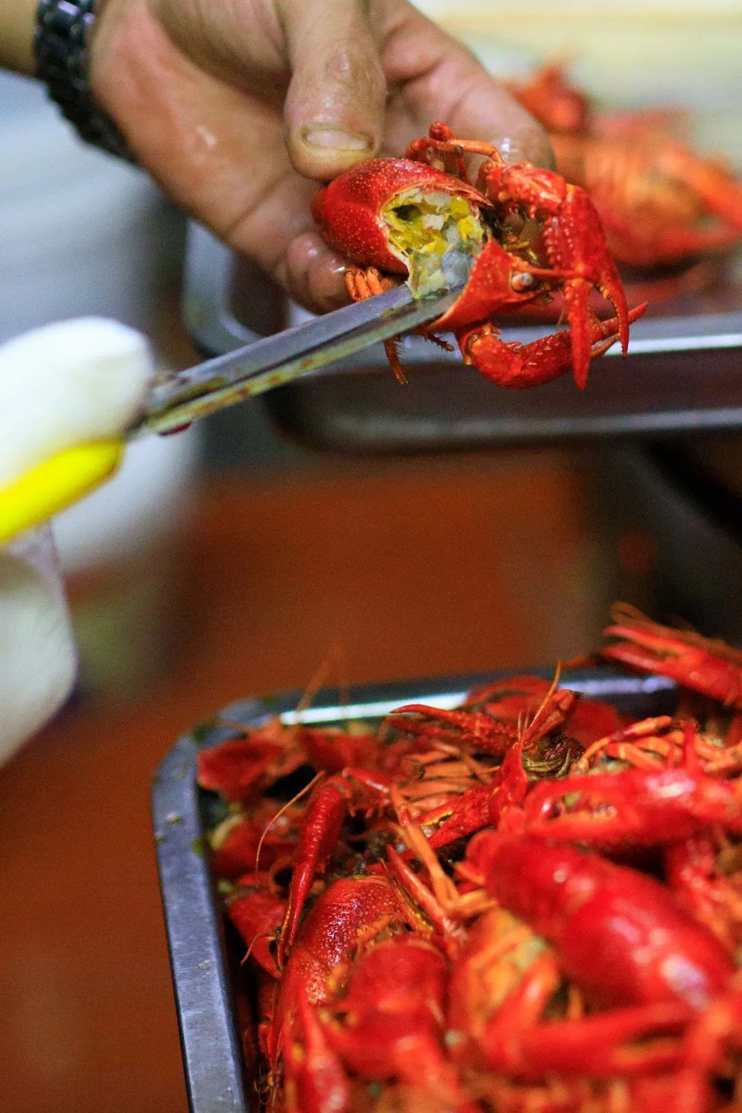 “今年是我们跃杨小龙虾的第九年,我们一开始是做外卖。最开始就是一个在杨浦包头南路这里的小门店,就现在的厨房部分。那时候是没有客座的,后面慢慢的发展了几张客座,然后又扩展到楼上,有了包间。”跃杨小龙虾(包头南路店)的负责人海燕说。