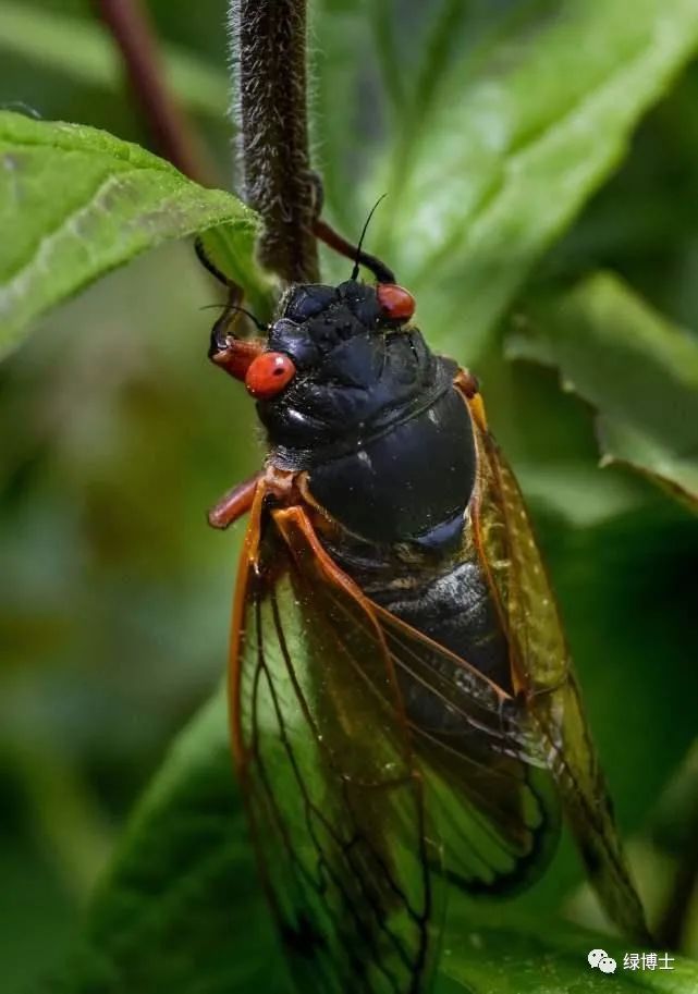 第三个阶段是成虫,若虫在土中蛰伏三五年后,会在植物根部附近的地面上凿出一个个的洞,然后顺着植物的树干往上爬,找到安全位置后开始变身,也就是我们常说的“金蝉脱壳”,“脱壳”后就成为正儿八经的知了,这个阶段的它们最为常见,每年夏天就是它们趴在树干上,扯着嗓子叫唤。