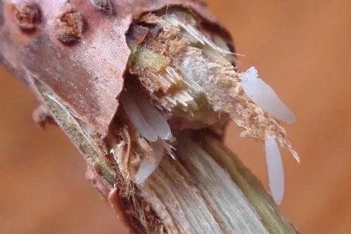 第一个阶段是卵,一般是产在植物当年新长出的嫩枝的枝干里,细细长长的像米粒一样;