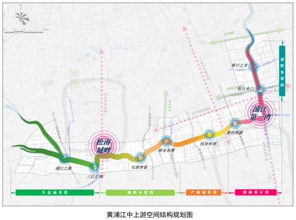 根据上海市规划和自然资源局《黄浦江两岸(中上游)堤防与生态景观专项规划》,黄浦江中上游岸线自然景观即将进行大开发,在松江新城南部滨江区域和黄浦江、大治河“十字水系”区域,形成两个功能核心,并与特色岸段结合布局八个景观节点,分别为浦江之源、三江汇湾、长溇梦影、韩仓水博、冈身听涛、紫竹西渡、杜行水门、塘口之舟。
