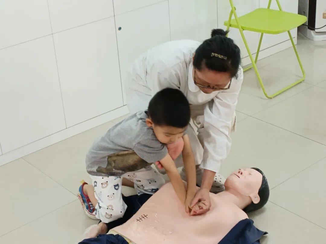 通过现场播放的一段心肺复苏的教学视频,以及医生的讲解和护士的示范,小朋友们对心肺复苏的“黄金八分钟”和动作要领有了更多的了解。接着,孩子们在护士的指导下尝试着心肺复苏,按压,吹气,认真体会动作要领。