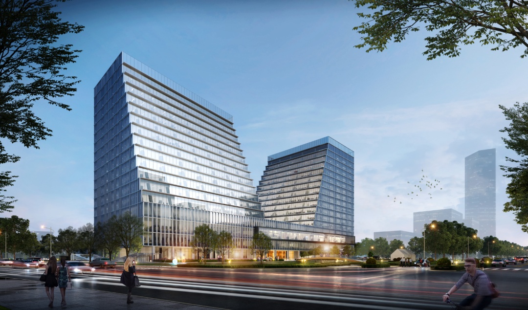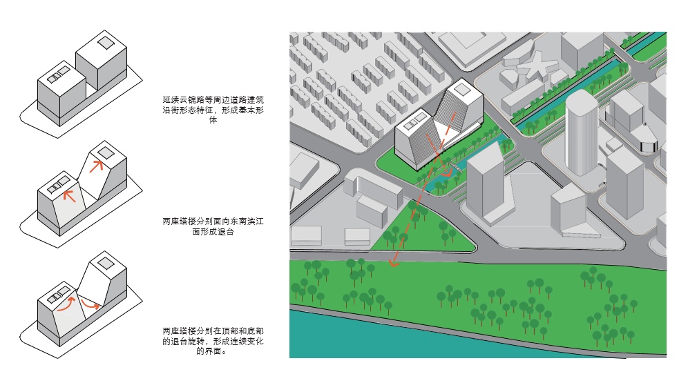根据介绍,项目建筑延续云锦路等周边道路建筑沿街形态特征,形成基本形体。主体部分的两座塔楼分别面向东南、滨江面形成退台,且分别在顶部和底部进行退台旋转,形成连续变化的界面。外立面以金属明框玻璃幕墙为主,色彩和材质与环境相协调。