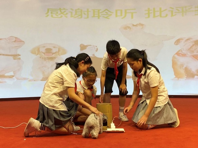 “我们先将宠物饲料放入储粮桶,然后在定时开关上设定喂食时间点,当到达这一时间点后,系统会自动投放食物,食物沿着斜坡掉落在食盆里,便实现了宠物自动喂食。”学生赵珎妮和她的队员们认真地给观众讲解着“宠物自动喂食器”的原理,说罢,还让自家的小泰迪狗充当主角,现场演示了一把如何喂食,欢乐的场景让座位上的学生们纷纷好奇地凑上前去。