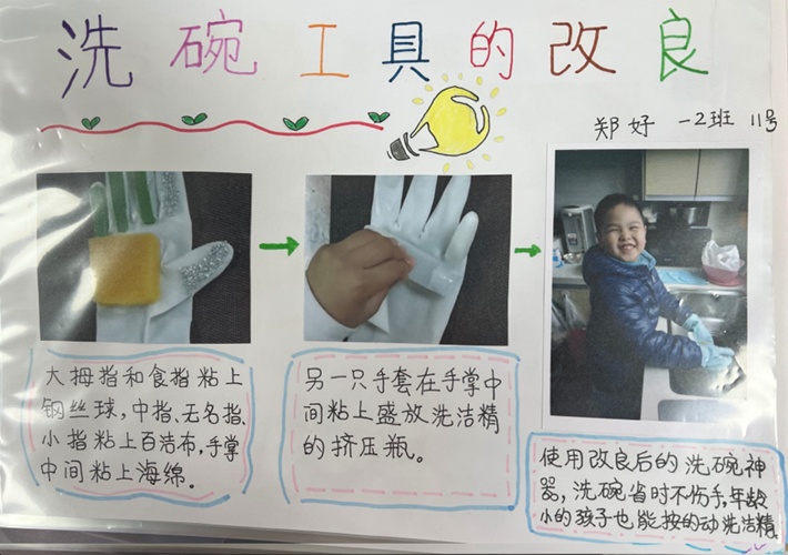 为了解决“小孩按不动洗洁精”“冬天的水好冷,不戴手套没法儿洗碗”“洗碗的工具太多、流程太繁琐”等问题,向日葵小队的学生们经过观察调研、制定方案、设计改良等多个阶段后,发明出了便捷而有创意的洗碗手套,将钢丝球、百洁布、海绵、洗洁精有机融合在了两个手套里。