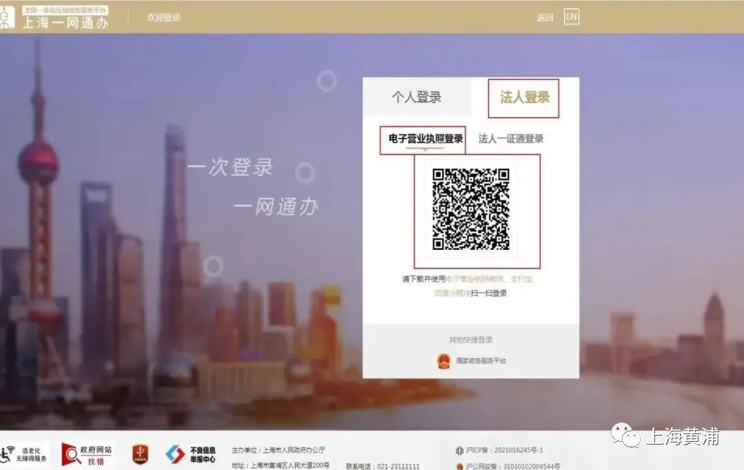 ①进入“上海一网通办”网址,通过电子营业执照或法人一证通登录系统。