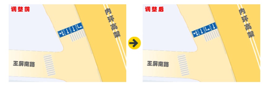据现场观察,内环高架武夷路下匝道处地面道路现已由原来的靠道路内侧依次为左转、直行、直行、直行加右转四车道,调整为靠道路内侧依次为直行、左转、直行、直行加右转四车道。与此同时,周边的道路指示牌进行了换新,沿线地面标识也重新绘制。