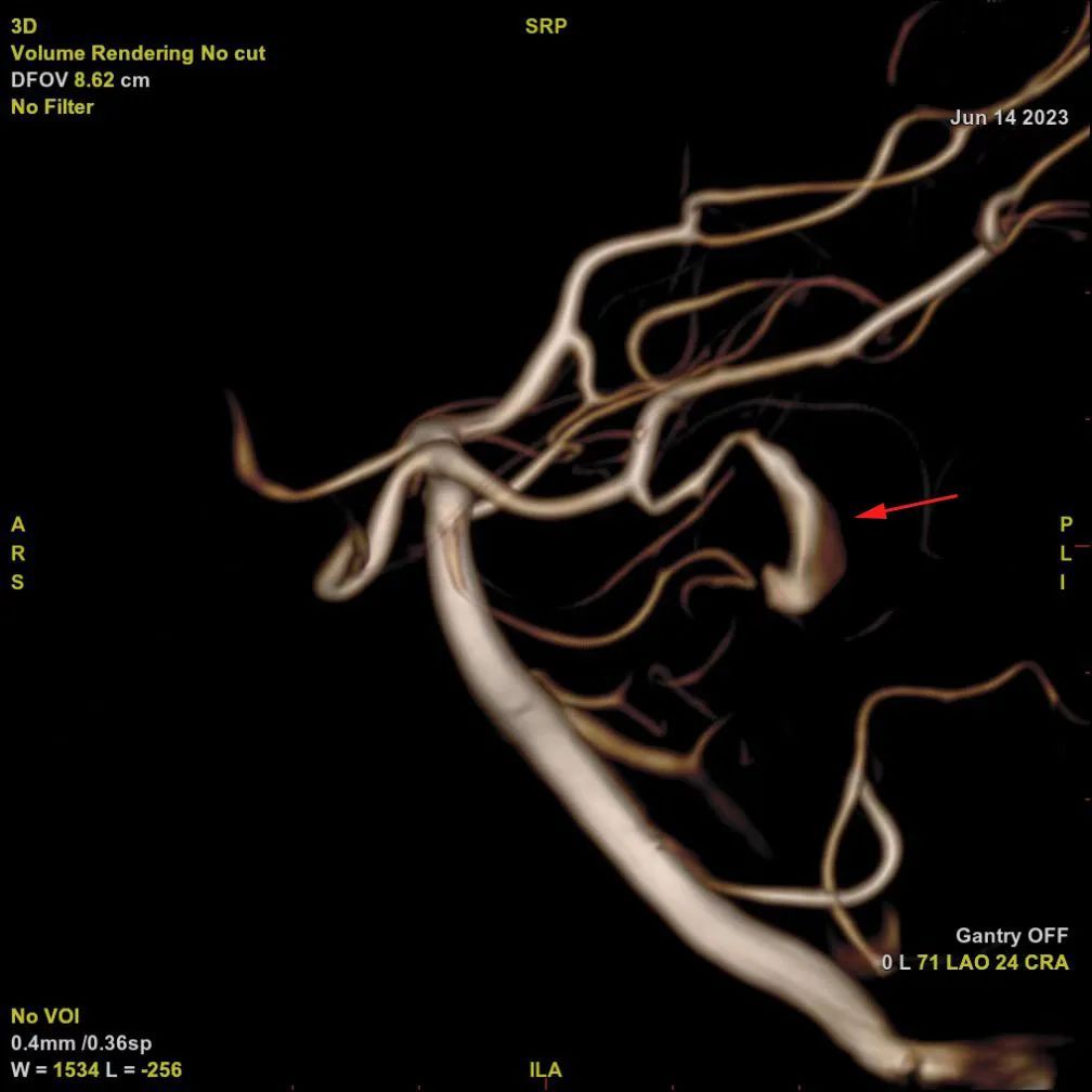 入院后,中山医院神经外科张晓彪主任带领脑血管病团队对其病情进行了深入地讨论,小马的脑血管造影结果进一步证实了团队的判断:左侧大脑后动脉一条大约1毫米直径的细小分支上有明显的扩张延长,考虑颅内夹层动脉瘤!此种病变容易引发脑内出血或脑栓塞,就像埋藏在大脑深处的一颗“不定时炸弹”,一旦爆炸,后果不堪设想。