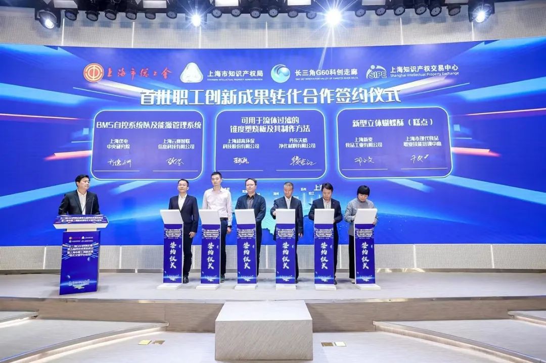 上海市职工创新成果转化交易平台首拍会上,邓小文(右二)代表企业签约,正式将新型立体蝴蝶酥专利技术转让于上海现代食品职业技能培训中心。
