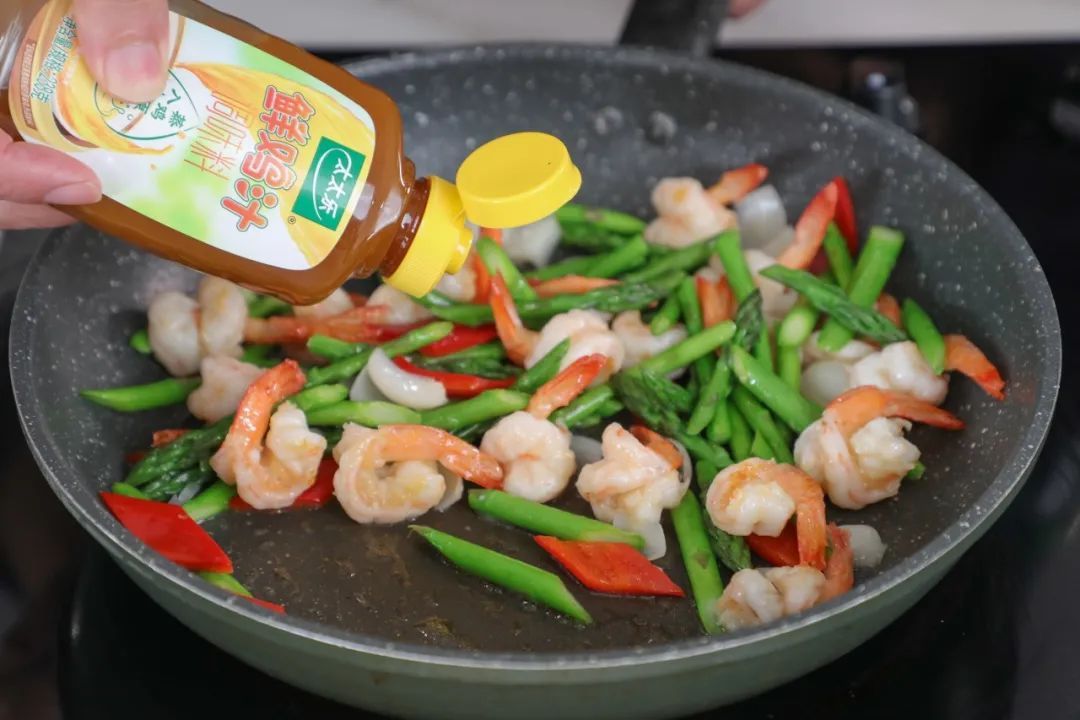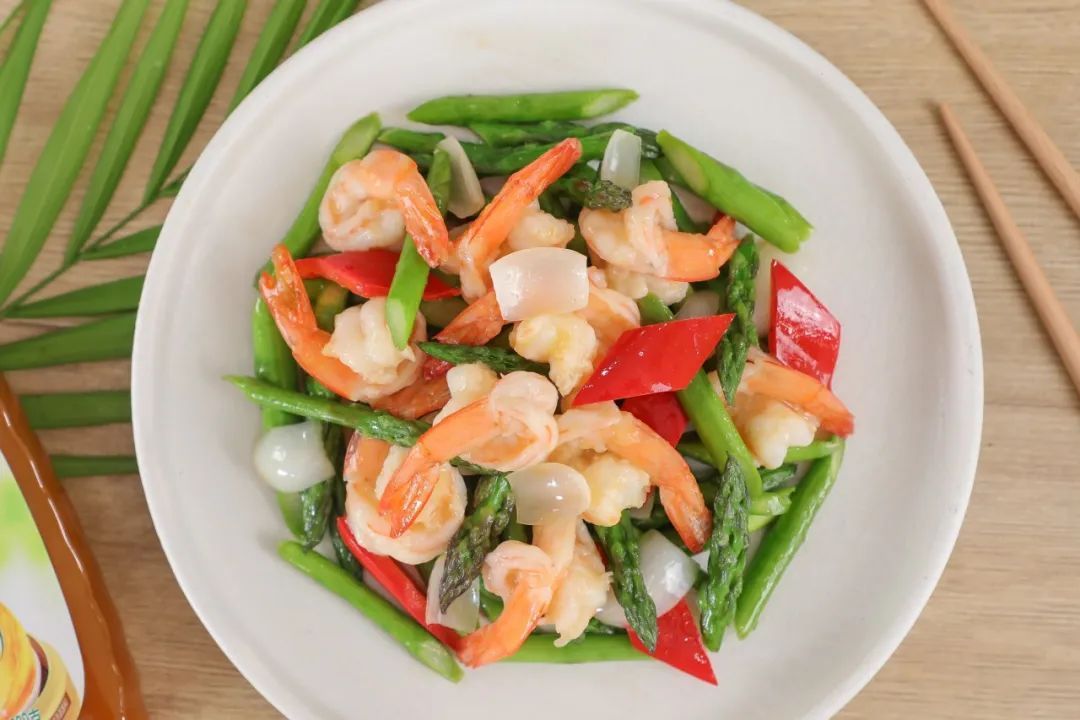 4.锅中留底油,放入芦笋百合翻炒均匀,加入少许鲜鸡汁调味料、糖,翻炒均匀后放入虾仁,继续翻炒均匀即可。