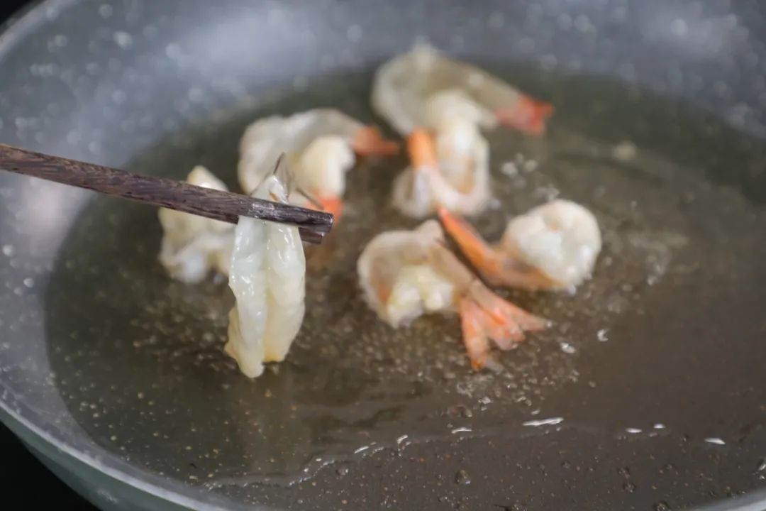 3.凤尾虾仁放入锅中煎至变色,成熟后捞出待用。