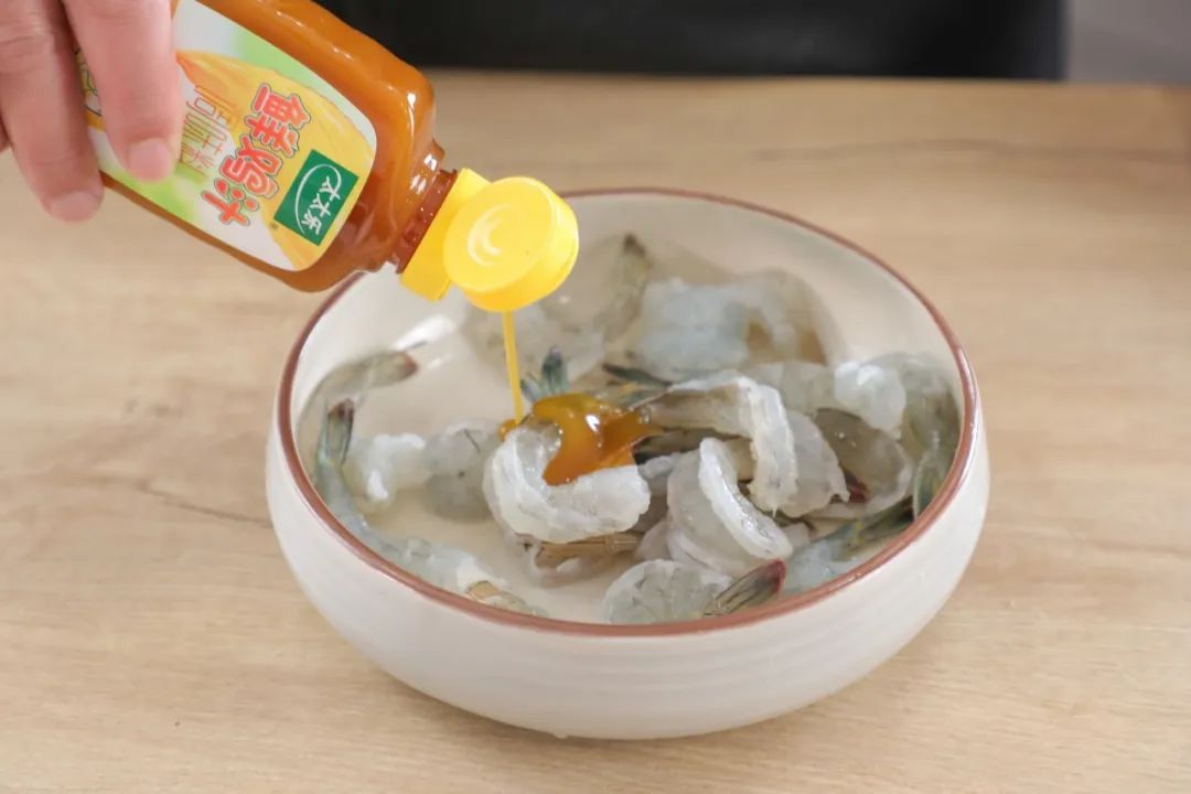 1.基围虾冰镇后剥去头壳,留下尾巴做成凤尾虾仁,加入少许鲜鸡汁调味料和原味鲜料酒,拌匀后加入生粉5克,再次拌匀。