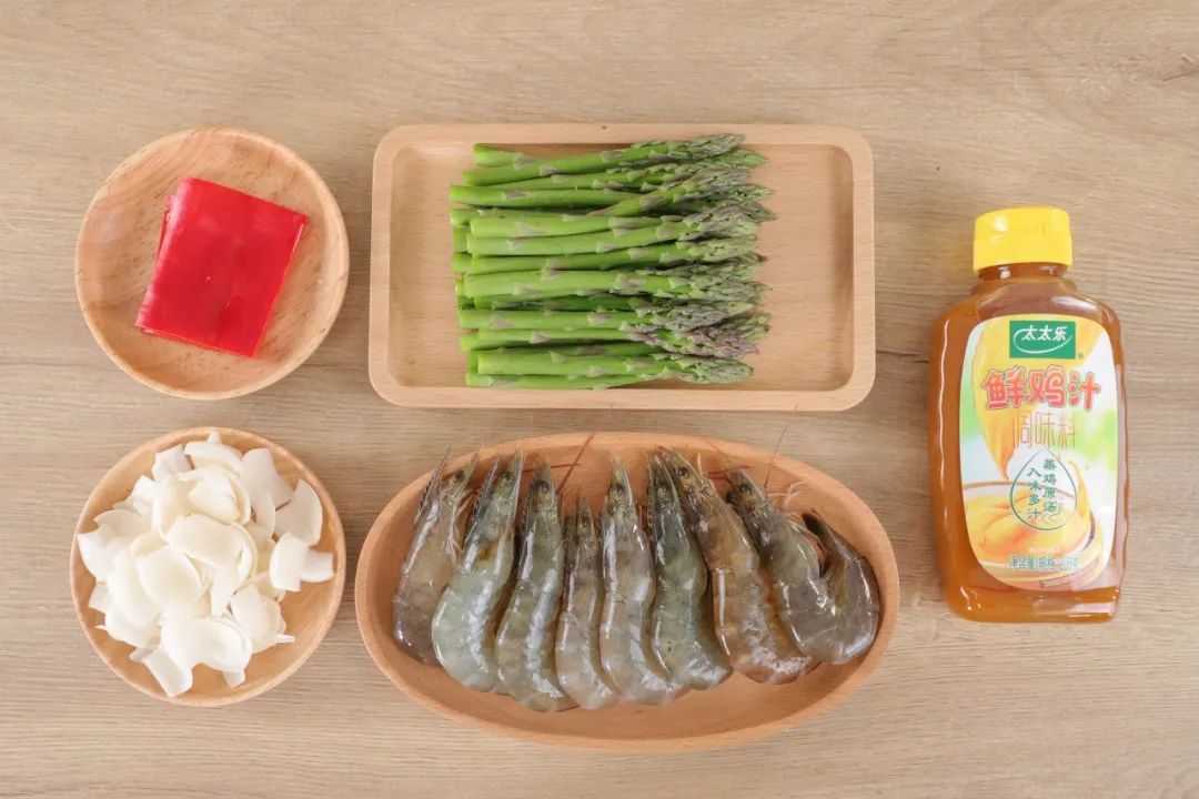 兰州百合50克、芦笋100克、基围虾200克、鲜鸡汁调味料10克,原味鲜料酒、生粉、糖少许。