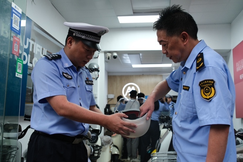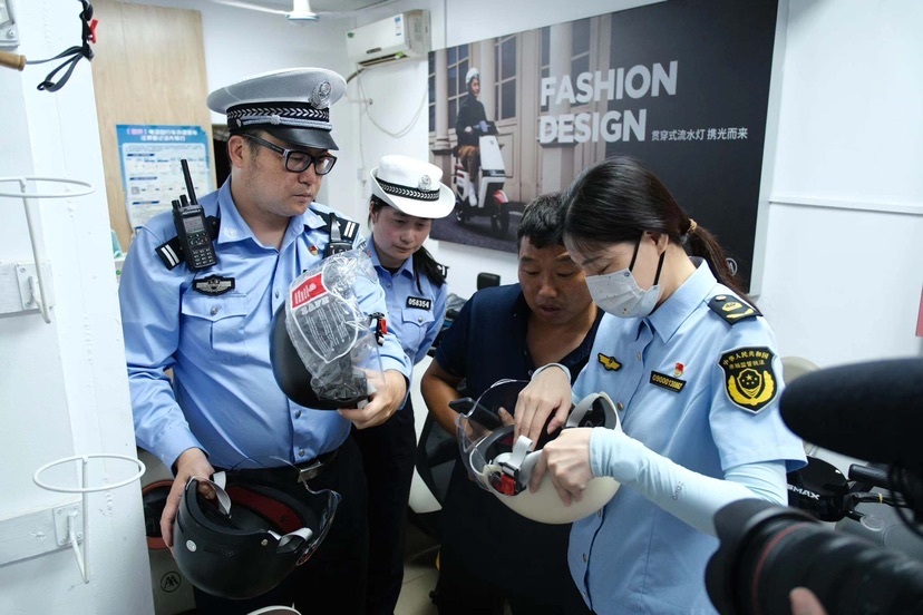 7月10日下午,浦东交警支队和周浦市场监管所的检查人员来到年家浜路418号的一家电动自行车销售商店进行宣传检查。在这家车行里,不仅有电动自行车售卖,旁边的货架上林林总总摆放了各类安全头盔。