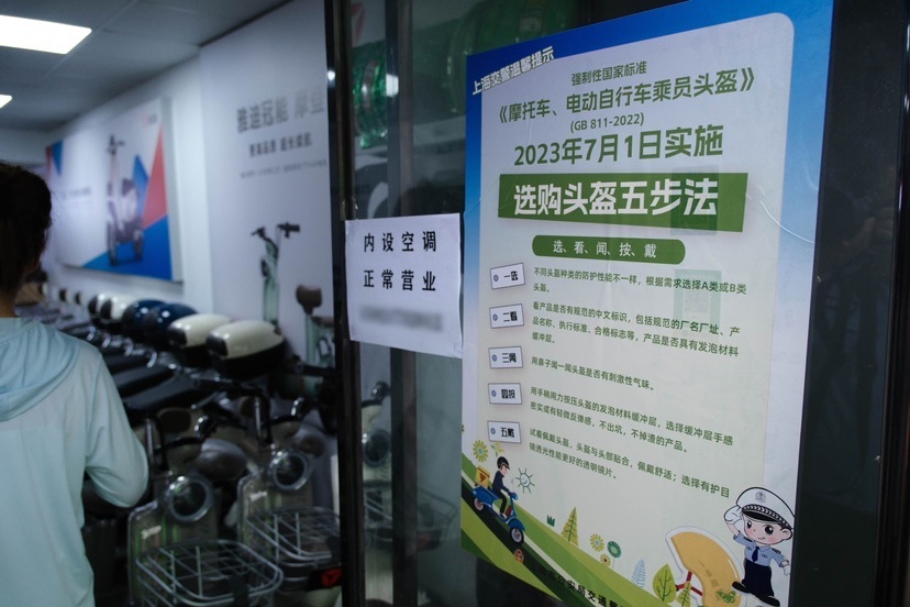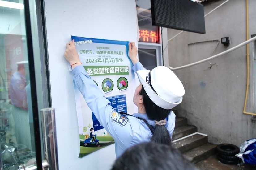 浦东交警六大队的民警在商店显眼处张贴了宣传海报。“老先生,你买头盔一定要买符合新国标的,骑行时一定要戴好盔,扣紧搭扣,一旦遇到事故,才能更好保护你。”浦东交警支队六大队一中队中队长赵启峰告诉前来购买头盔的顾客,劣质头盔在事故中极容易破碎,不但不能保护骑乘人员,反而会造成扎伤等二次伤害。