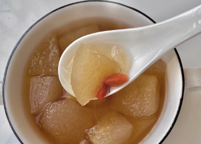 吃法三:去皮去核切成梨块,加入枸杞小火炖煮,入口即化,清肺止咳。