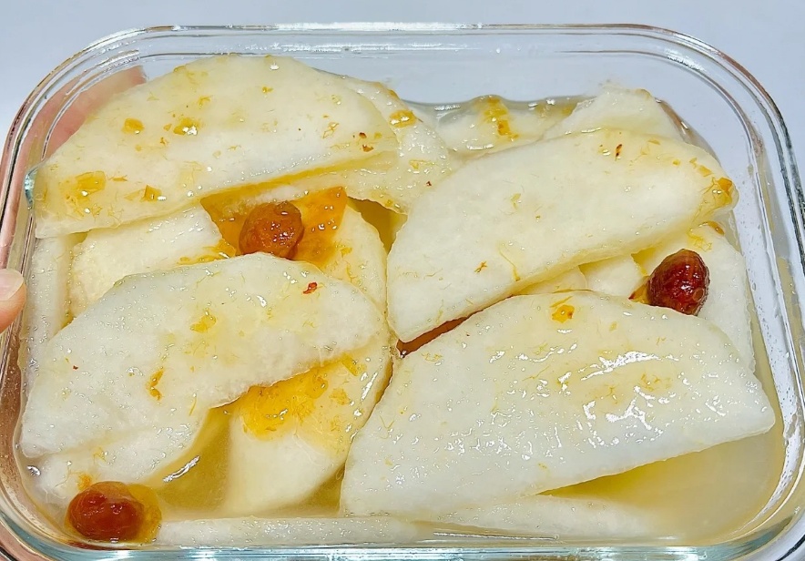 吃法二:去皮切薄片,加入酸梅汁,冰箱冷藏后酸酸甜甜,美味可口。