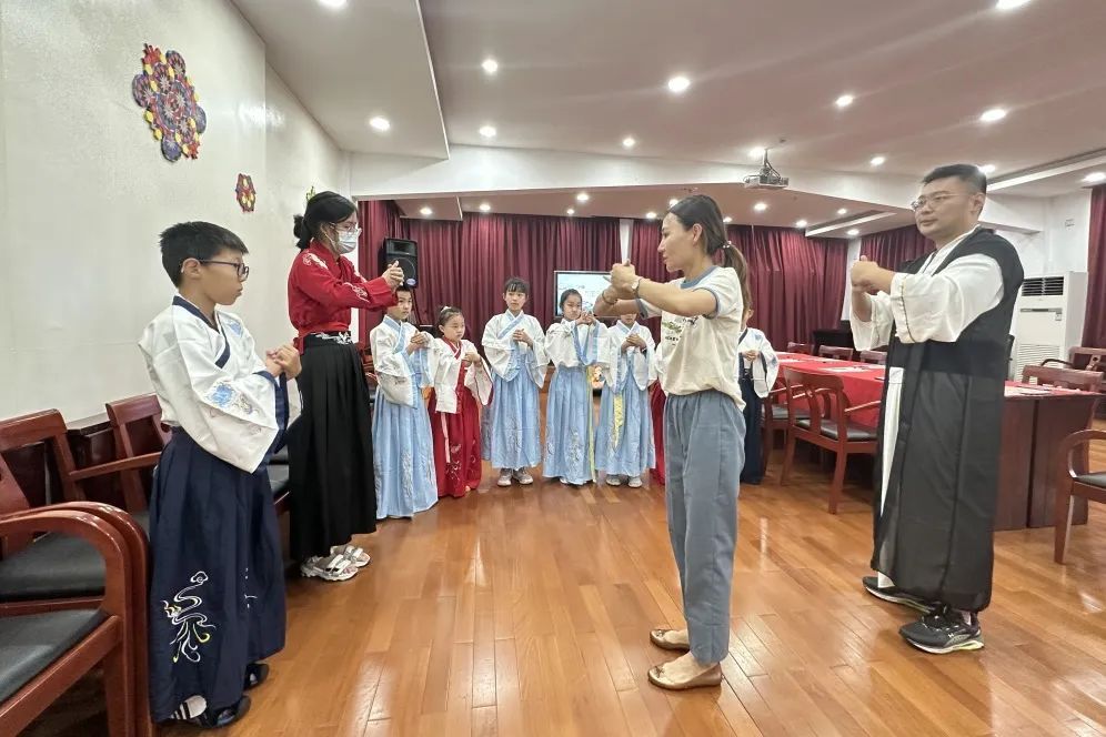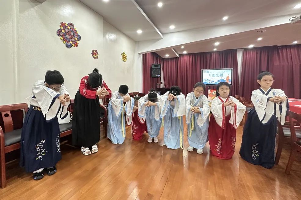 现场,孩子们自行选取十个剧本角色,穿衣打扮,仿佛穿越回大唐盛世。在老师的引导下,大家学习了唐代的拱手礼,并开始“自我介绍”。虽然都是第一次体验传统礼仪,孩子们却也一板一眼,学得有模有样。