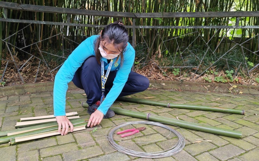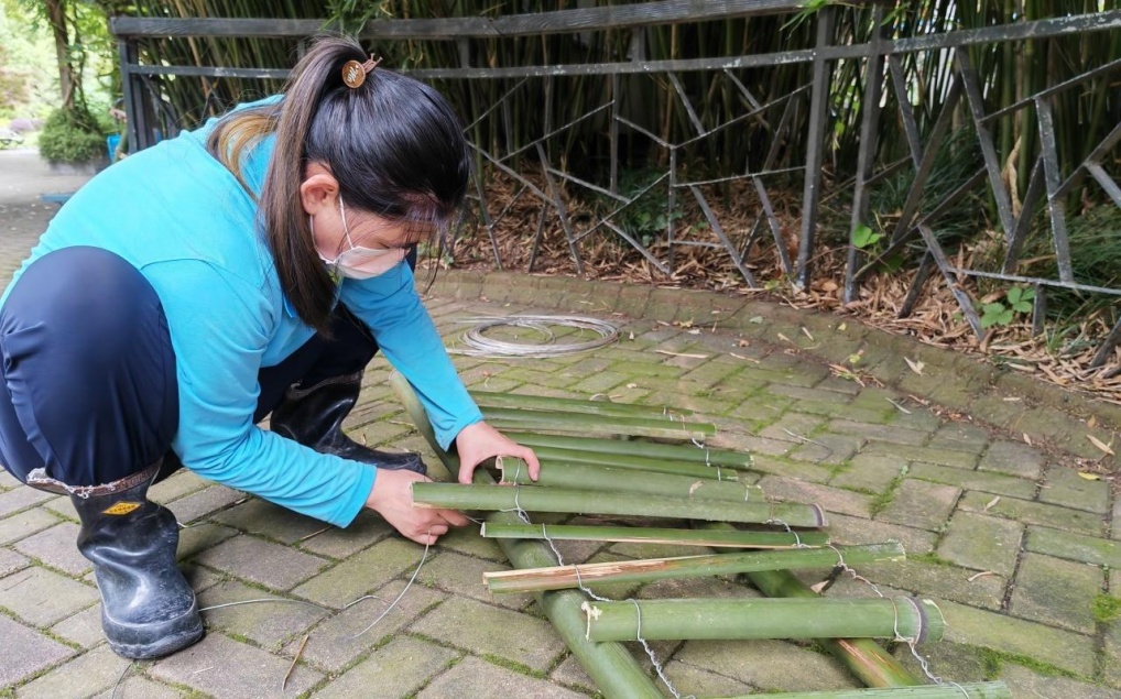 以往,金刚鹦鹉的玩具中用的最多的材料就是木材和金属,而这次大胆地尝试了竹子。两根圆筒形竹竿作为两边的支架,中间错落有致地横着几根被劈成两半的竹条,竹竿和竹条的每个交叉点用铁丝固定。最后,在两根圆筒形竹竿绕上带有竹叶的竹枝,既美观又安全。细微之处也是尽显用心,所有丰容材料使用前先进行消毒和安全隐患的排查,将竹子材料的边边角角打磨光滑,铁丝尖头不外露并包裹充分。