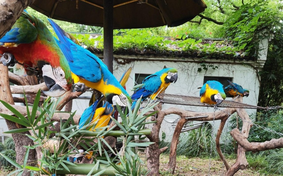 为了让金刚鹦鹉在圈养环境下生活得更加舒适,让它们自然行为更好的展示,同时加强游客的游园体验,上海动物园鸟队饲养员给它们的室外活动场地布置了许多丰容设施,还会不定期地给它们增加新玩具,时不时为它们创造新鲜感。