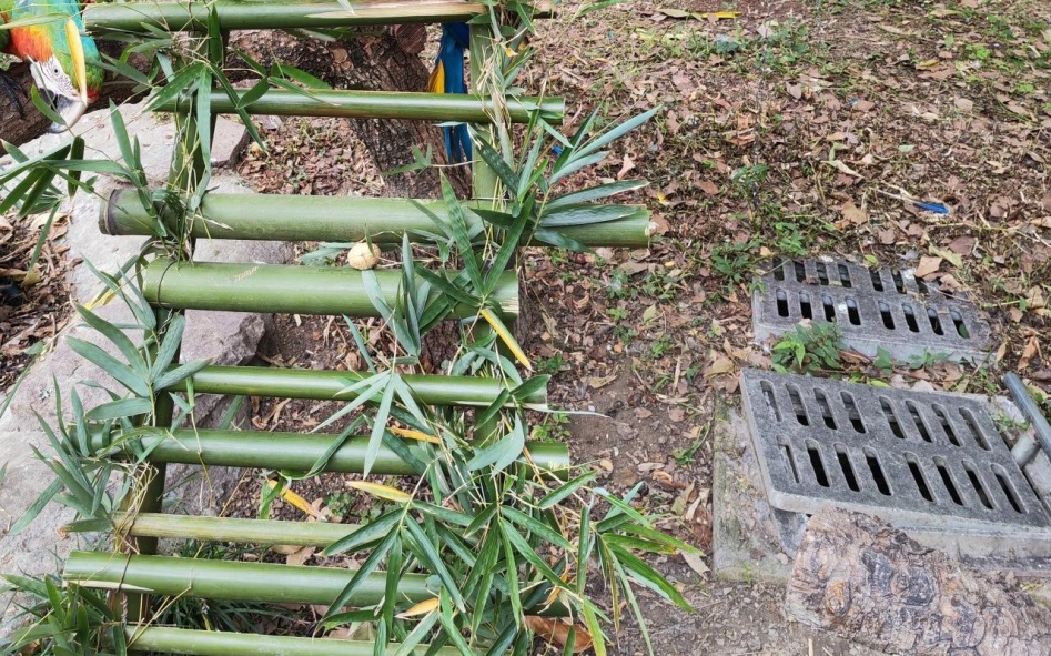 经过饲养员们的耐心制作,金刚鹦鹉喜提一把竹梯子作为新玩具。从制作材料上饲养员们进行了突破性创新。