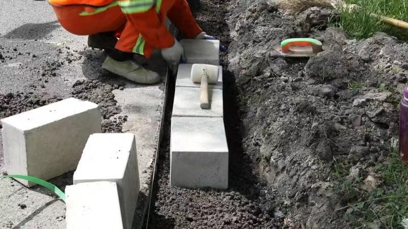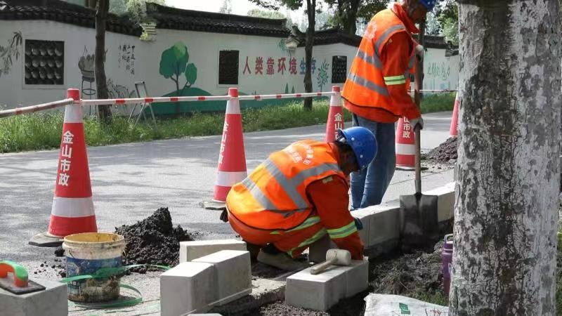 上午,记者在金张公路施工现场看到,道路的一侧已经摆满了锥形桶,工人师傅正在为该路段铺设路沿石。现场施工负责人告诉记者,金张公路连接张堰镇和吕巷镇,是一条镇镇对接道路。道路两侧分布了大量的企业,重型运输车辆较多。